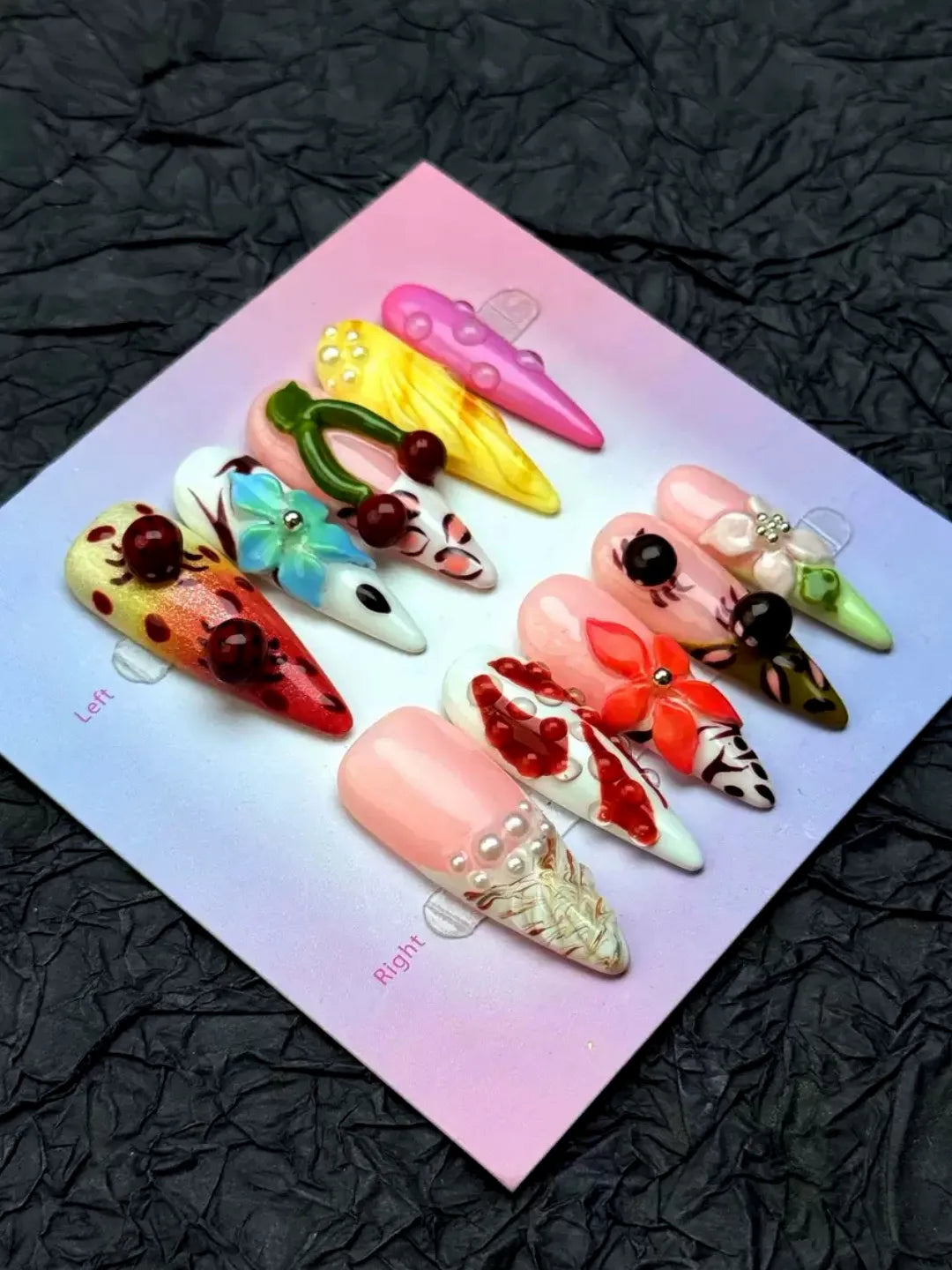 3D Carve nails with dopamine-inspired colors, bright and lively, intricately detailed, perfect for daily wear or parties to showcase personality and style.