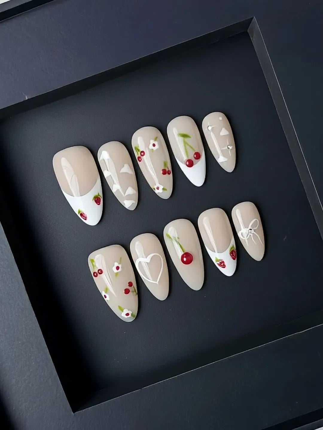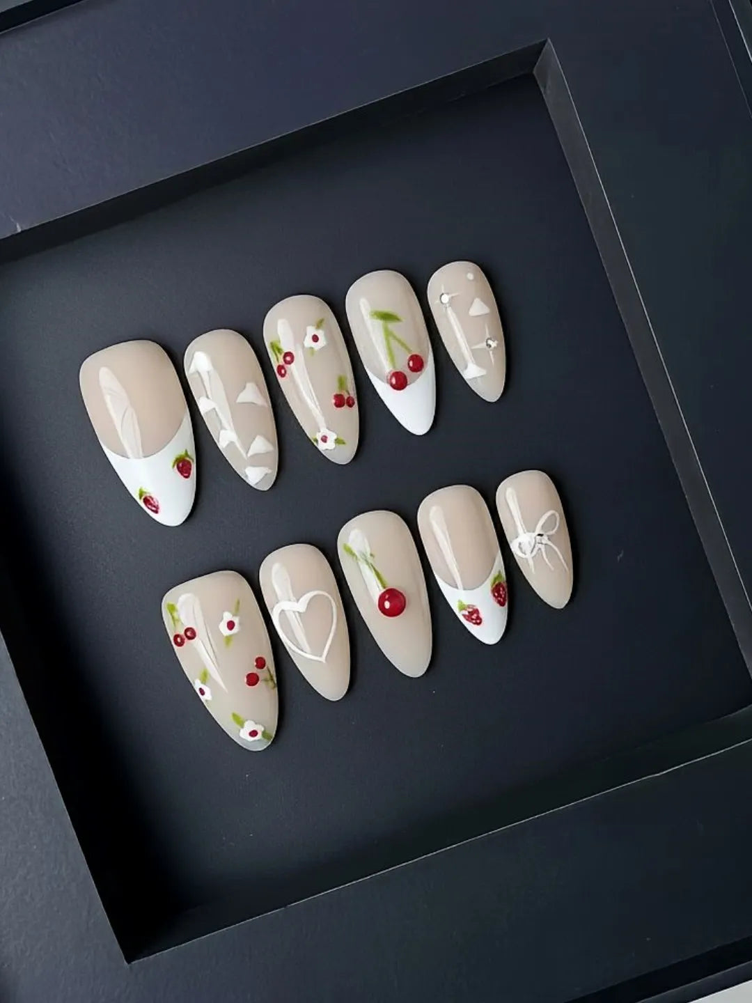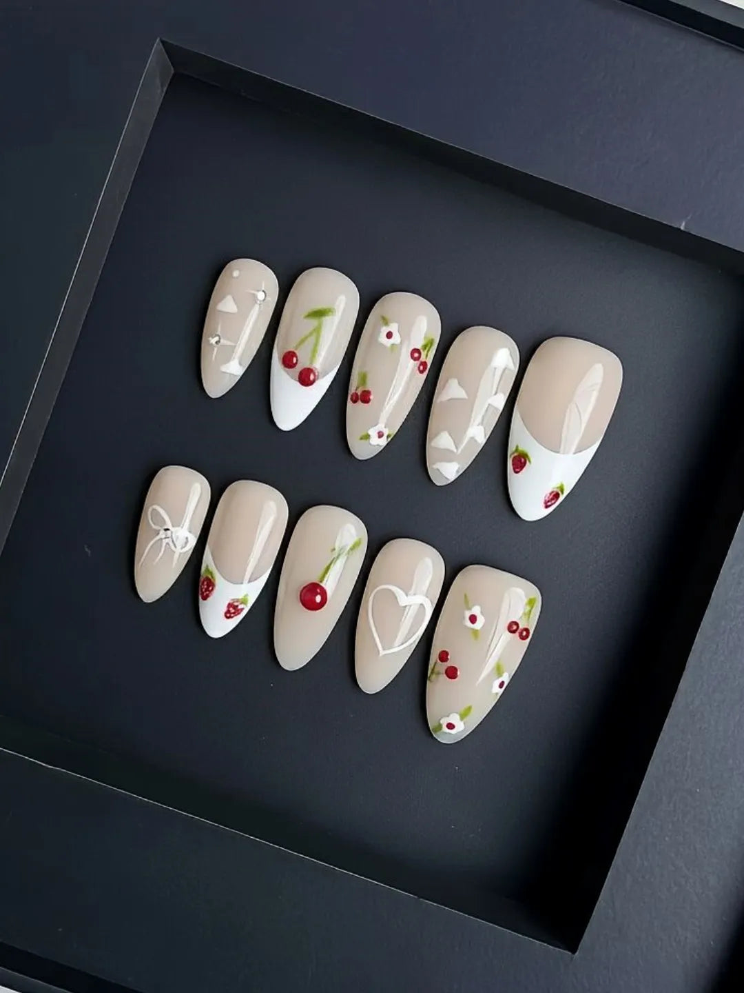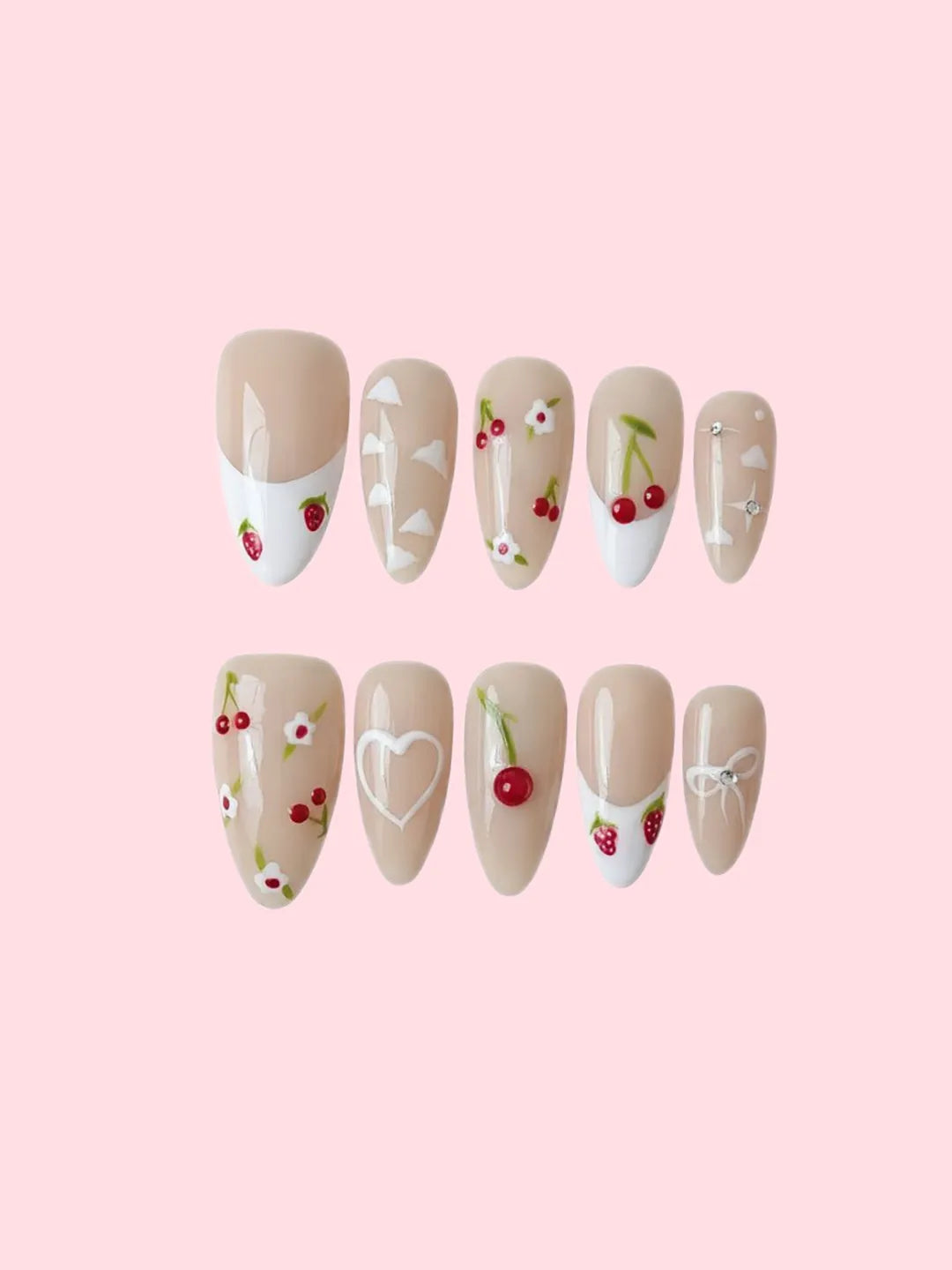 Cherry Bunny nails feature soft pink with playful bunny and cherry details, sweet and cute, perfect for daily wear or dates.