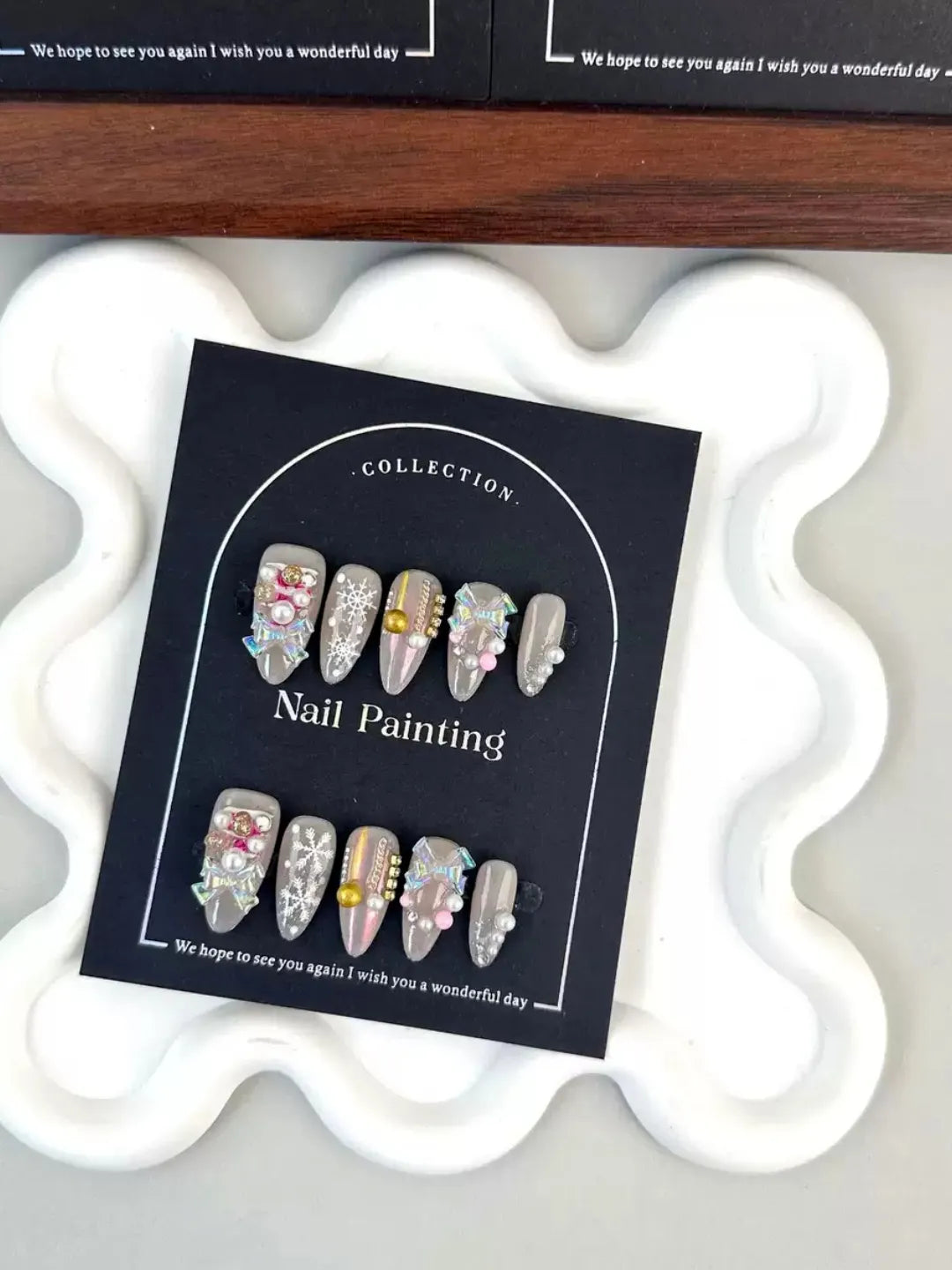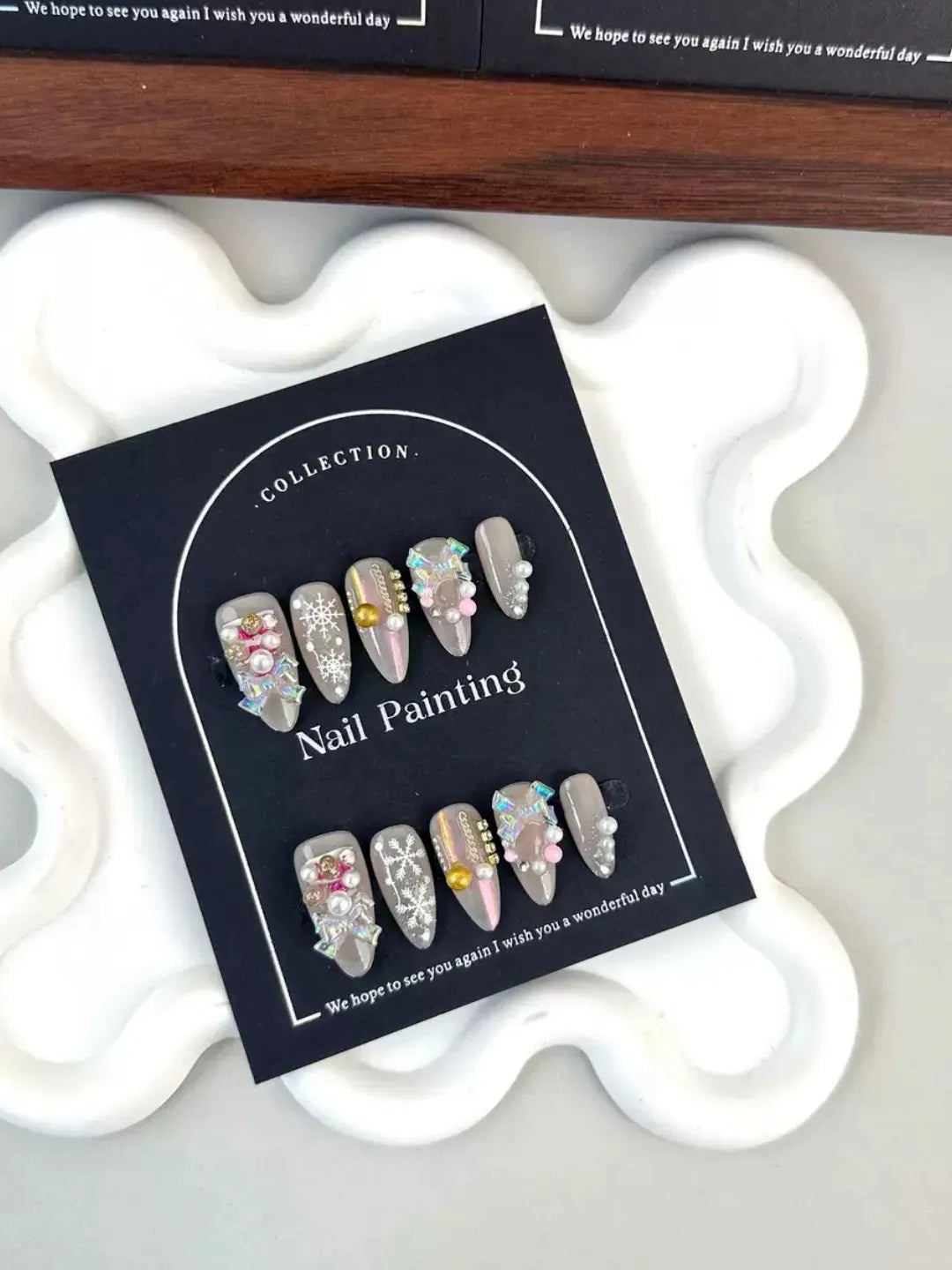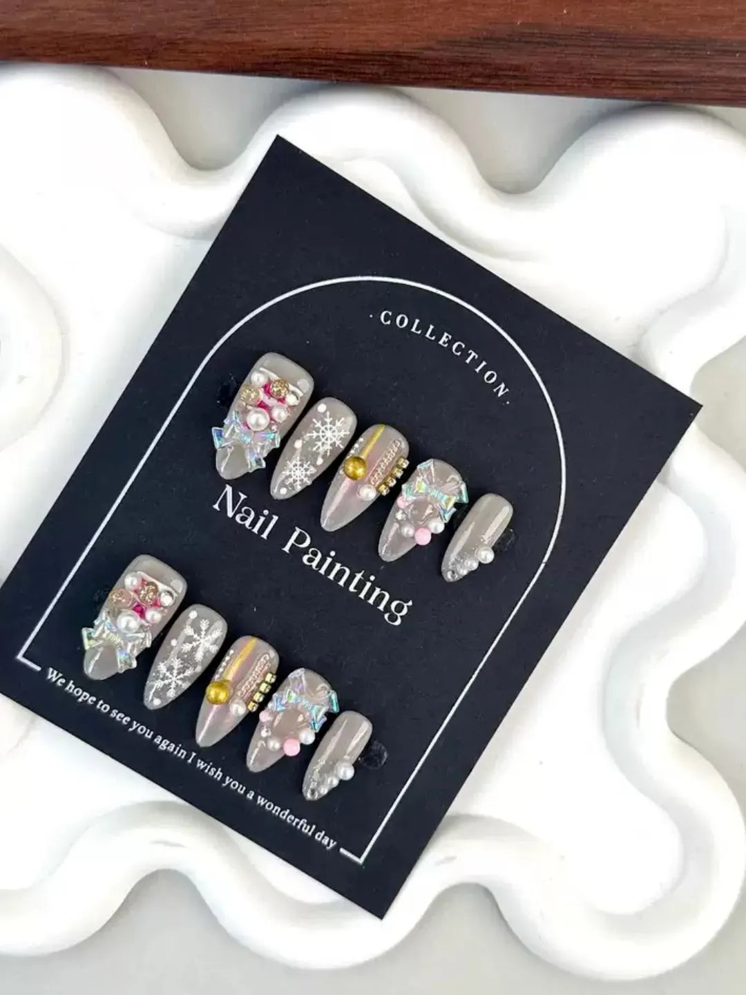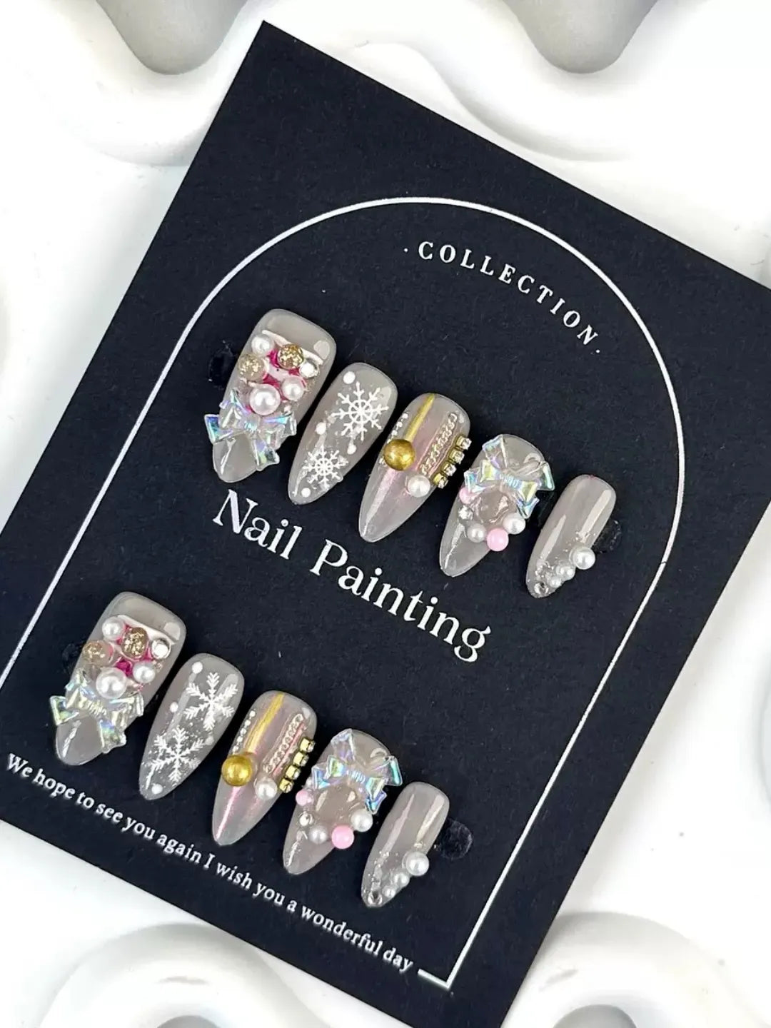 Nude base with hand-painted Christmas details and golden sparkle, subtle yet festive — perfect for winter elegance.