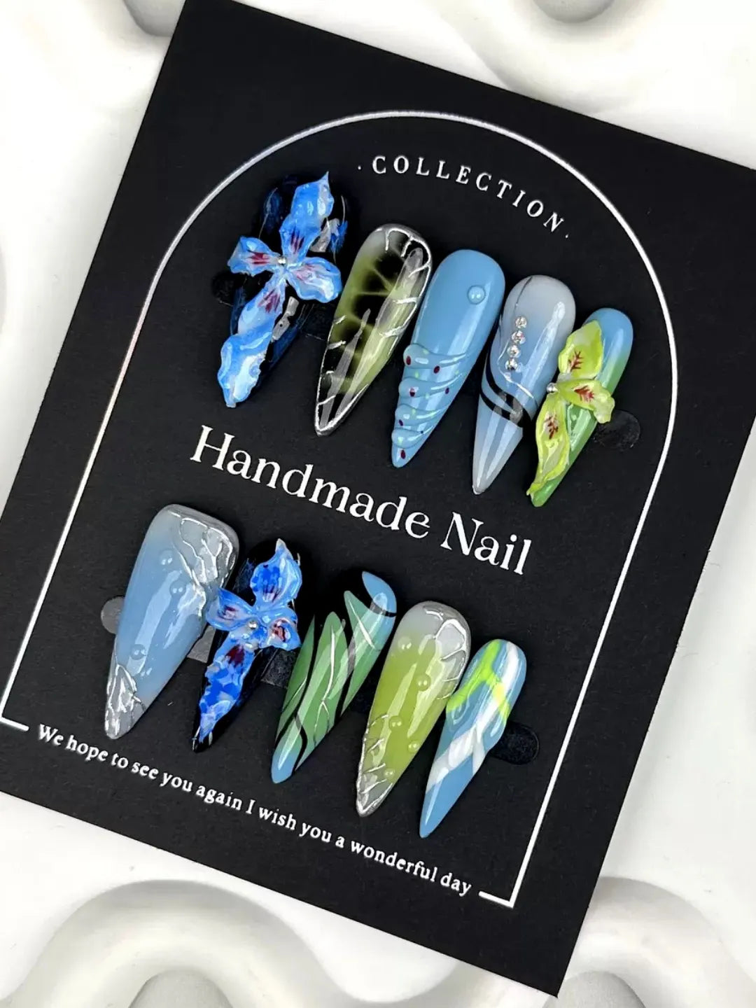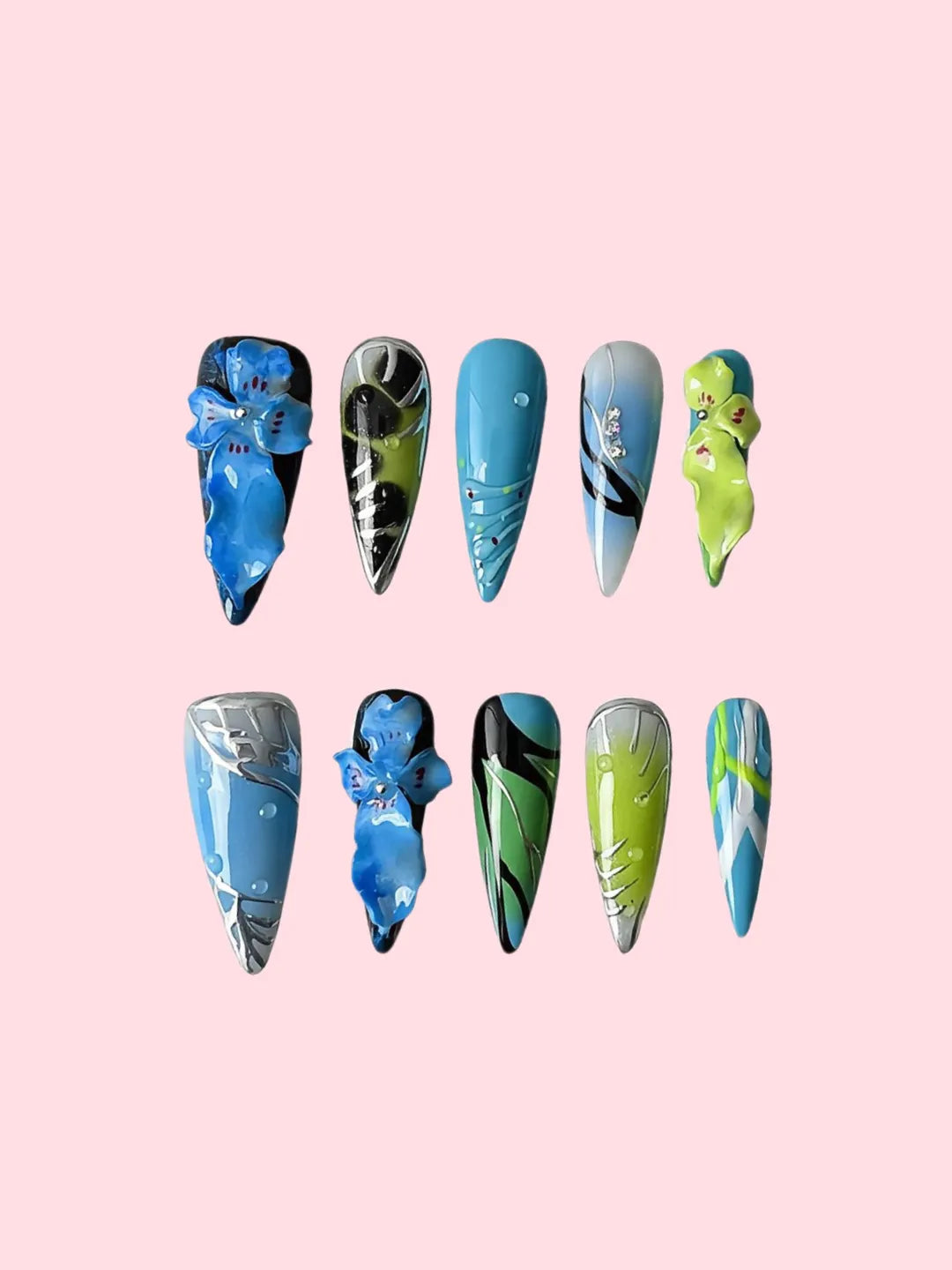Vivid color clash combined with embossed floral details — artistic, vibrant, and full of personality.