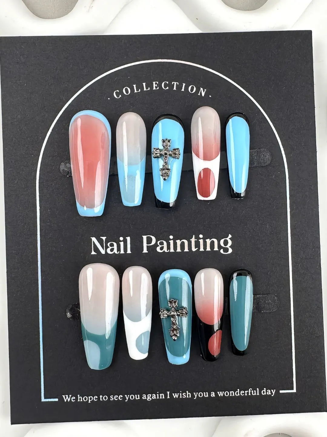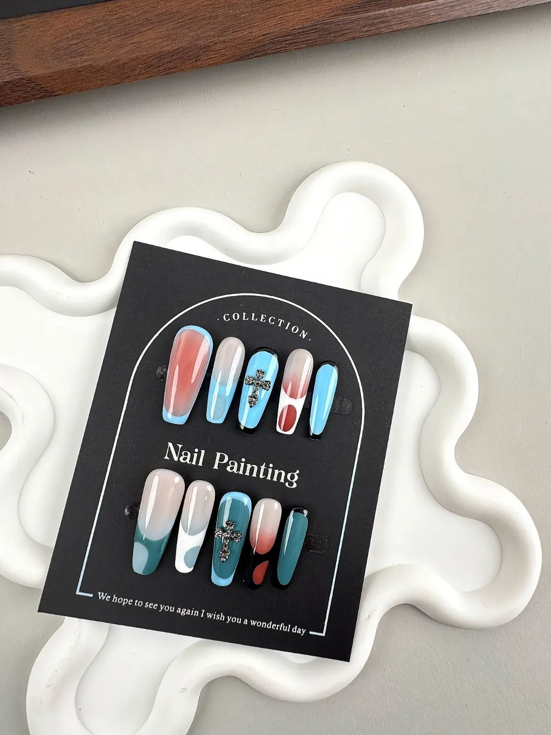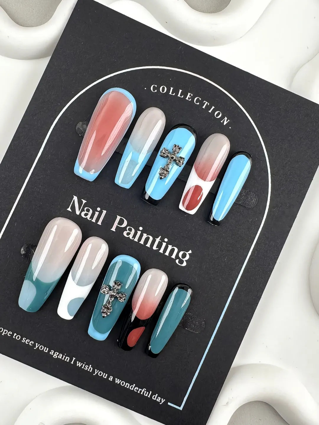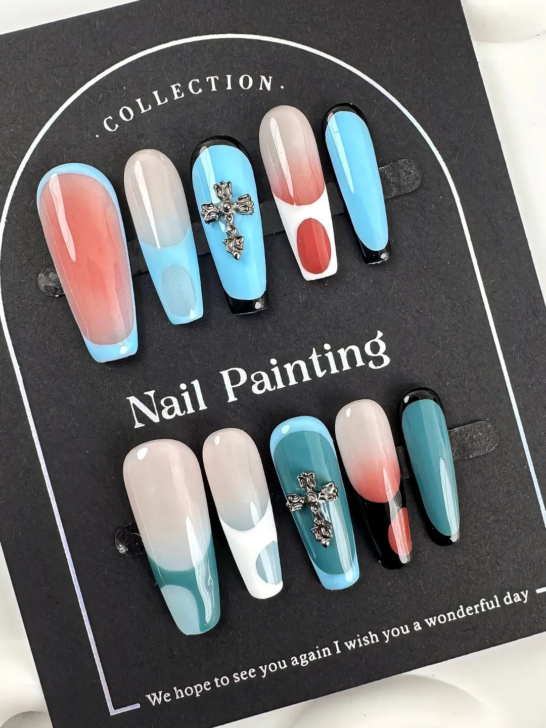 COLORFUL CONTRAST nails are handcrafted short press-ons with vibrant color contrasts, easy to wear, chic and fashionable, perfect for summer and Western-inspired looks.