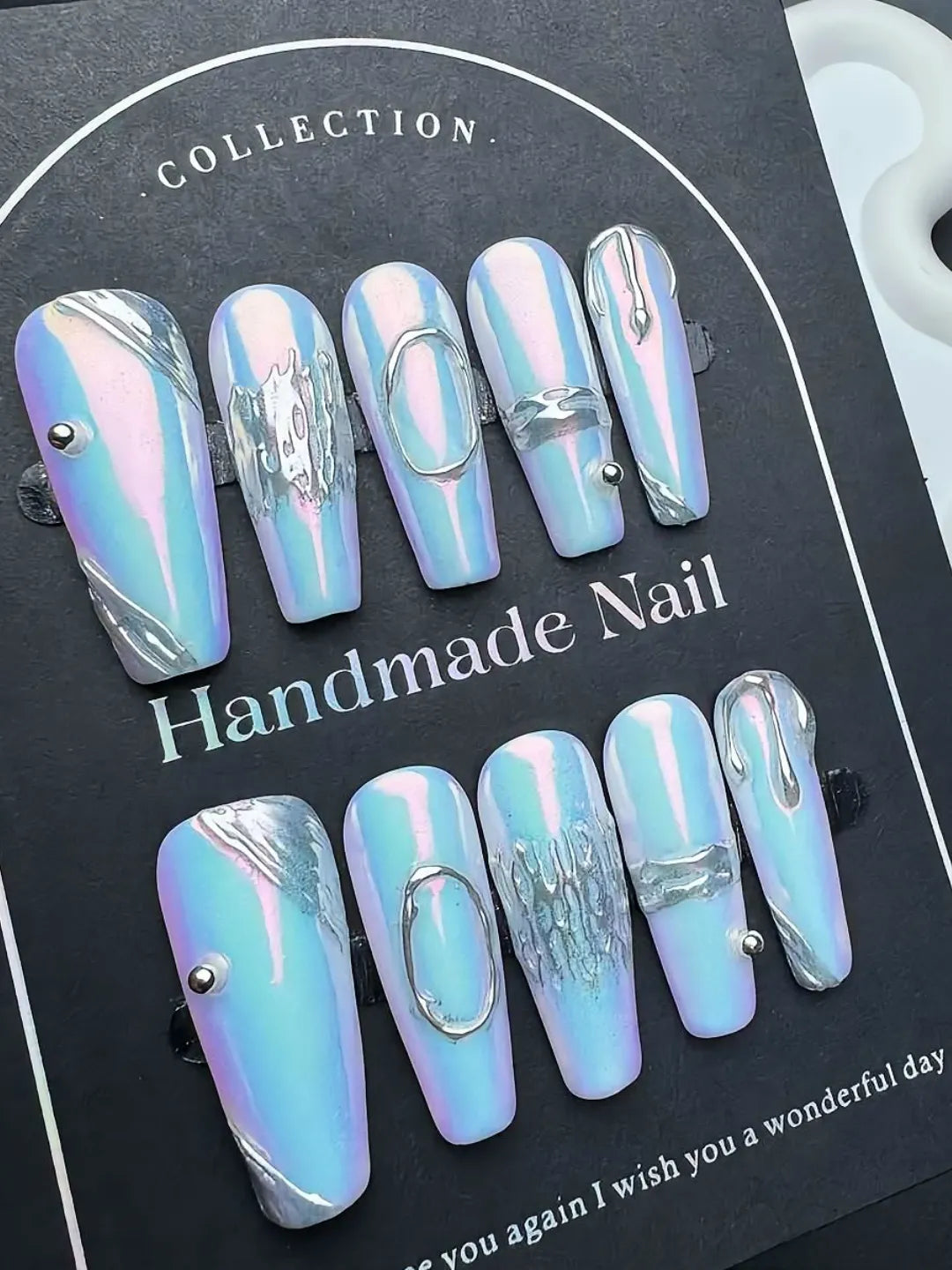 CYBER ALABASTER SET nails feature an alabaster white base with metallic shine, handcrafted long press-ons, sleek and futuristic, perfect for parties, nights out, and special events.