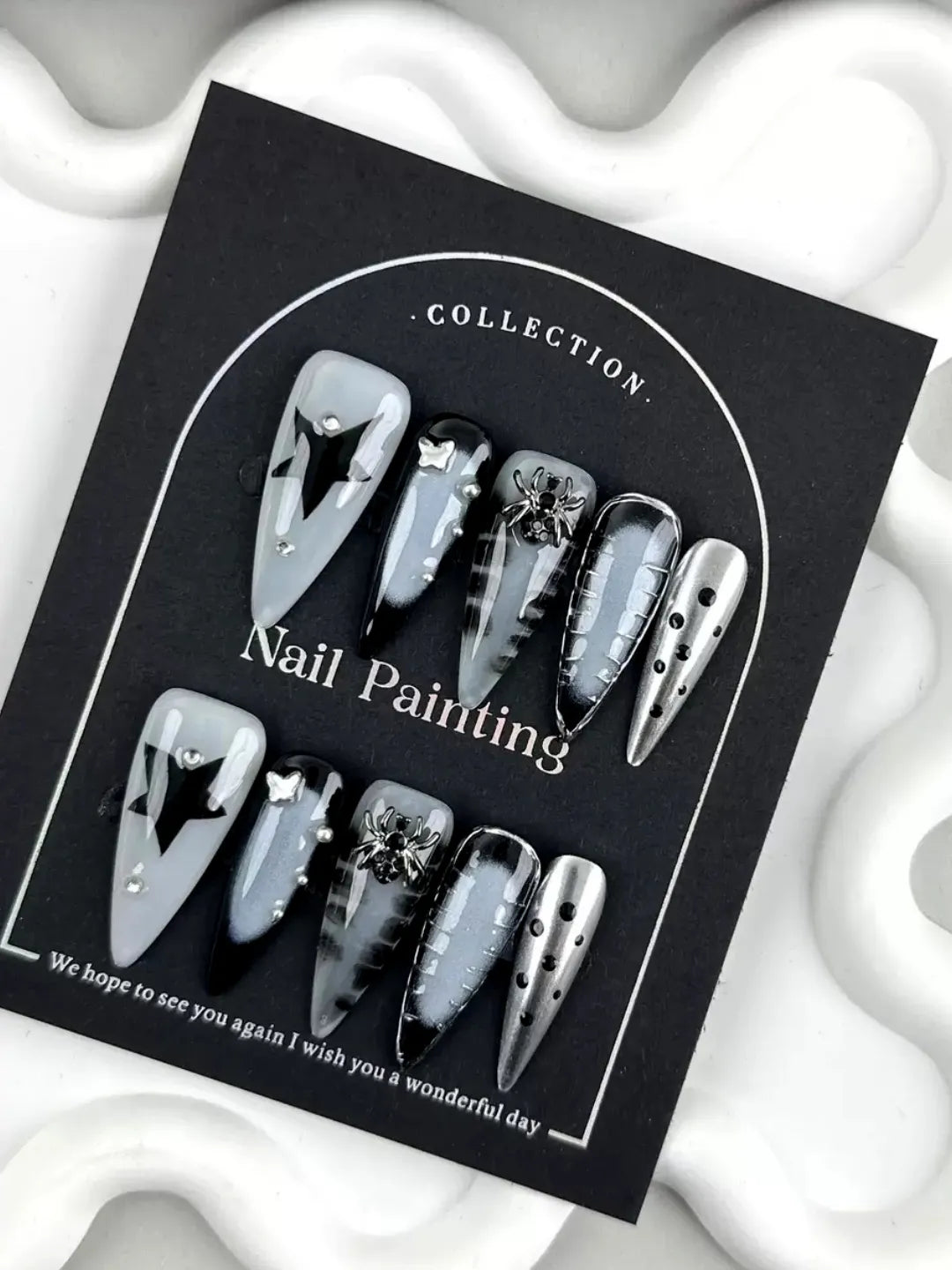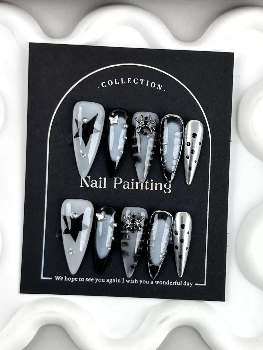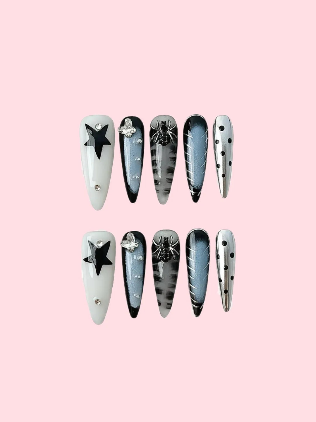 Dark gradient or metallic base with neon lines, geometric patterns, and sparkling accents — bold and futuristic, perfect for daily wear or parties.