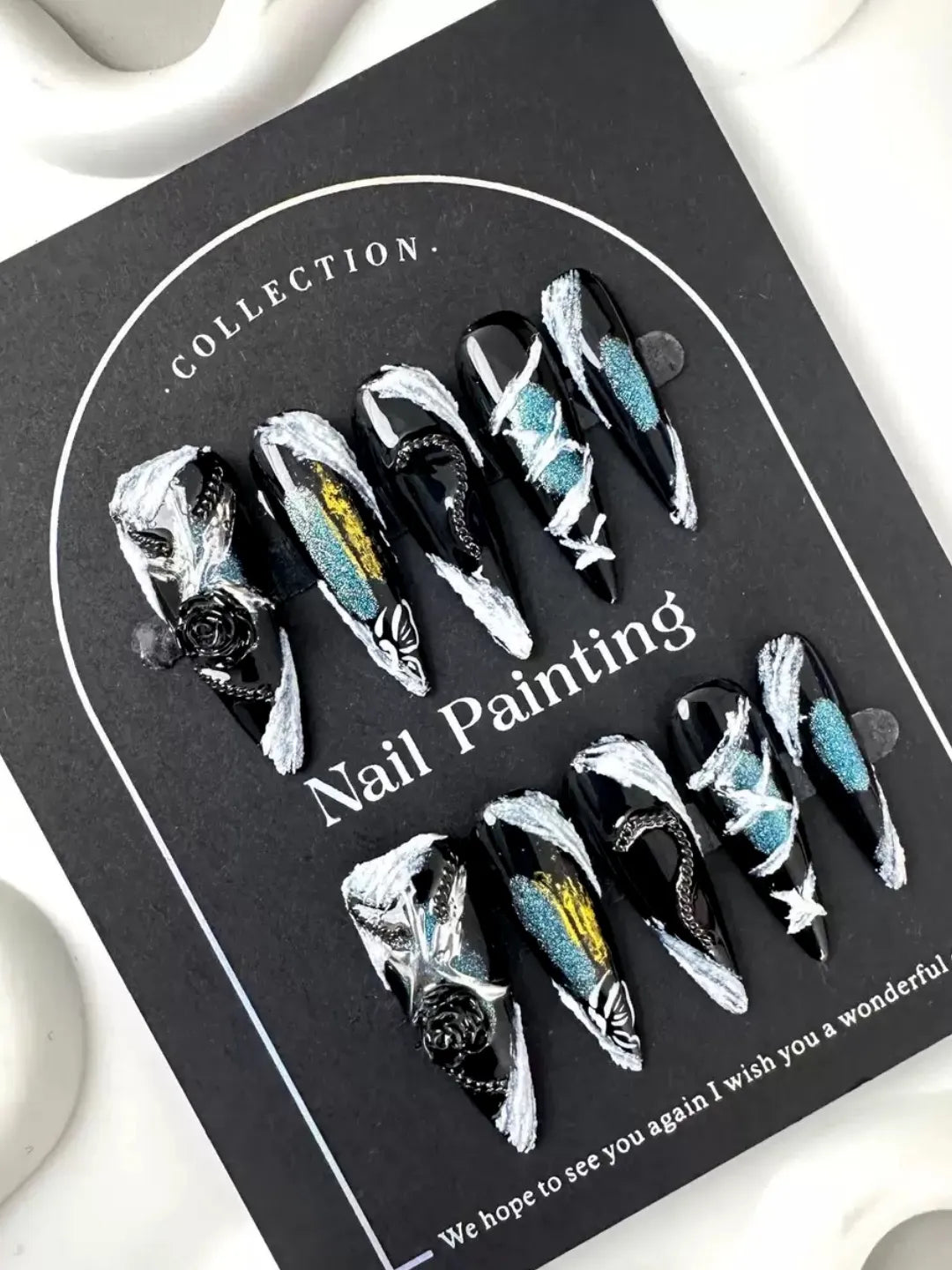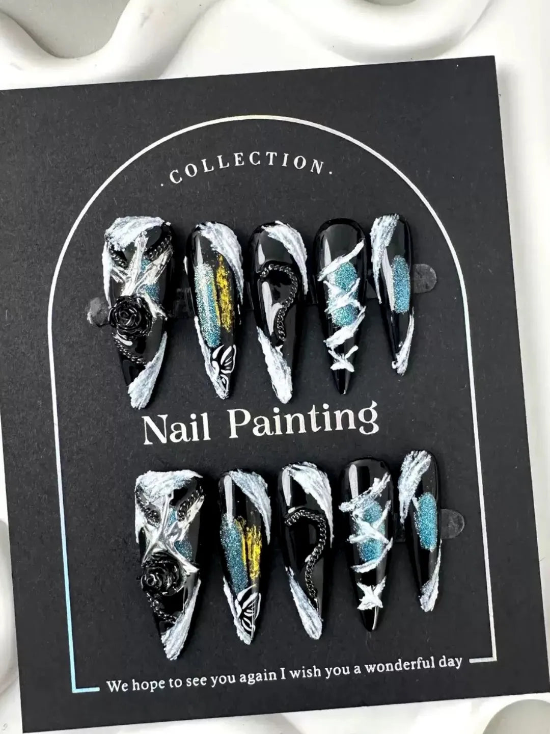 Dark or neon gradient base with hand-painted geometric lines and metallic accents β edgy and futuristic, perfect for daily wear or parties.