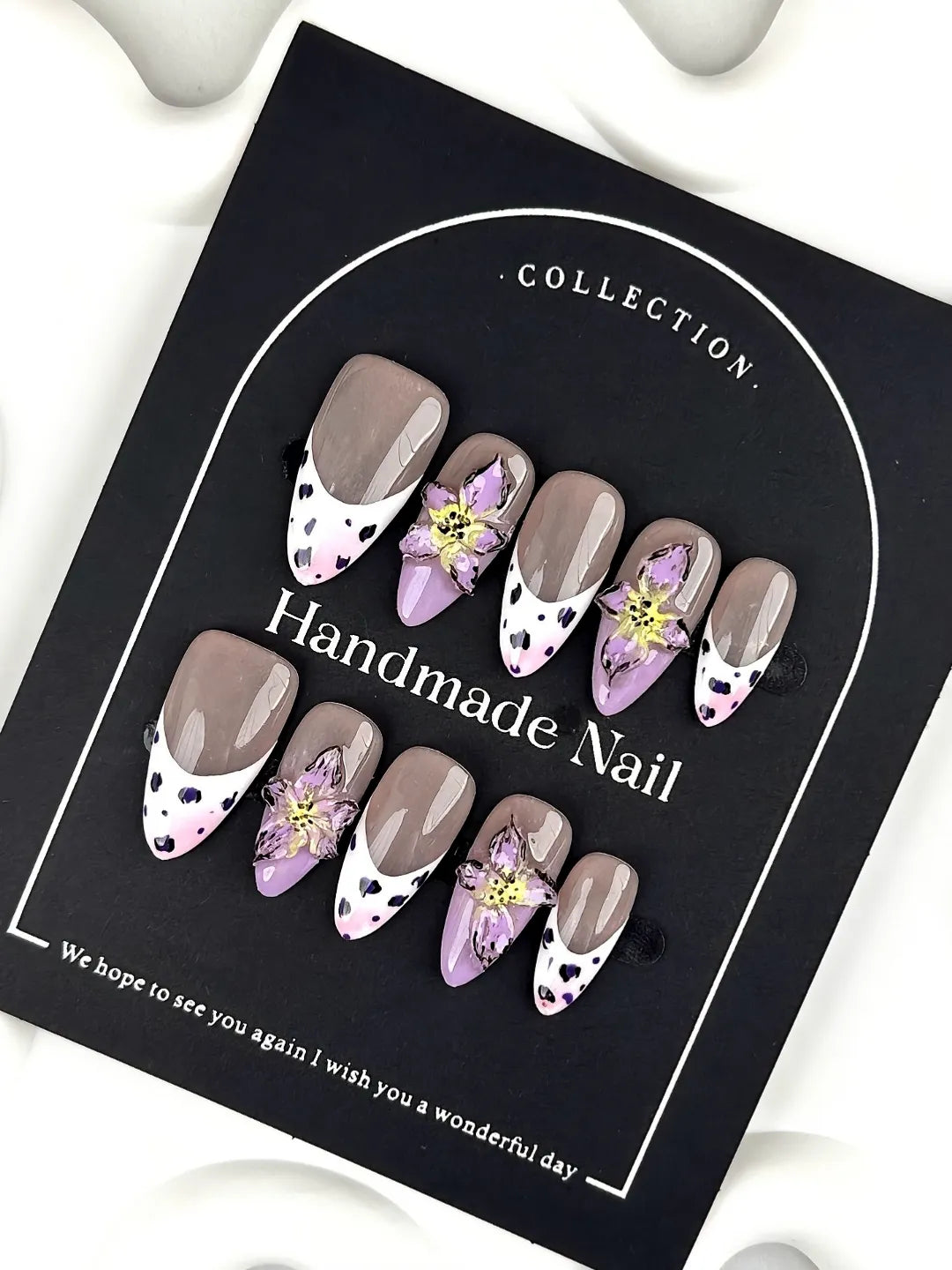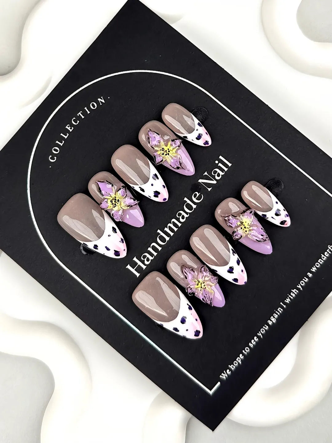 Short/medium oval nails with nude bases, cow-print French tips, and 3D purple flower accents. Cute, playful, and whimsical flower-power style.