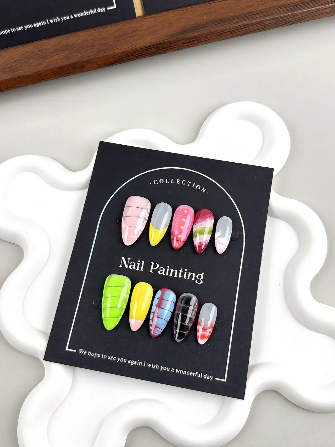 Handmade press-on nails with neon grid patterns and jelly finish. Bold, playful, and futuristic—perfect for standout, eye-catching looks.