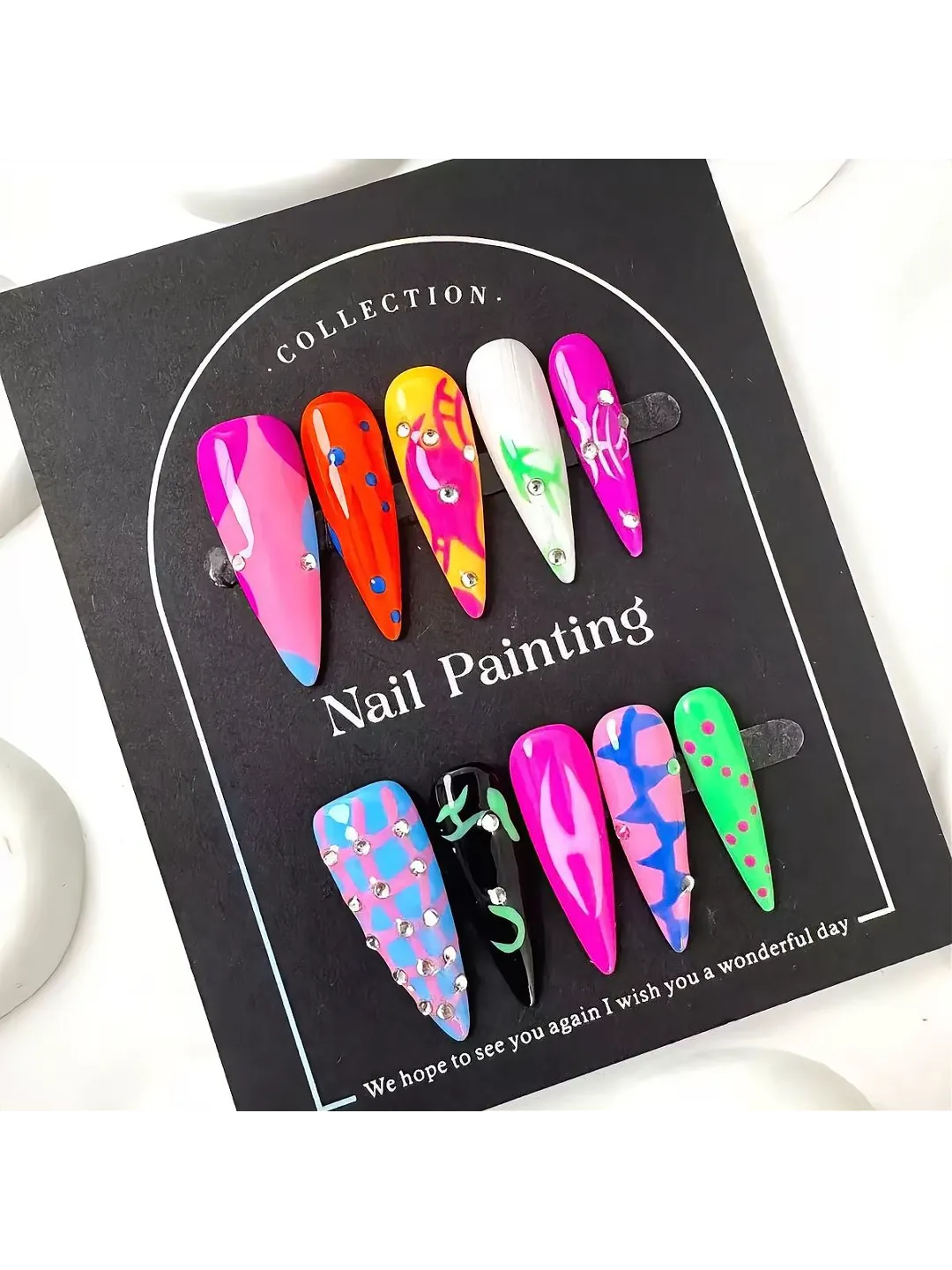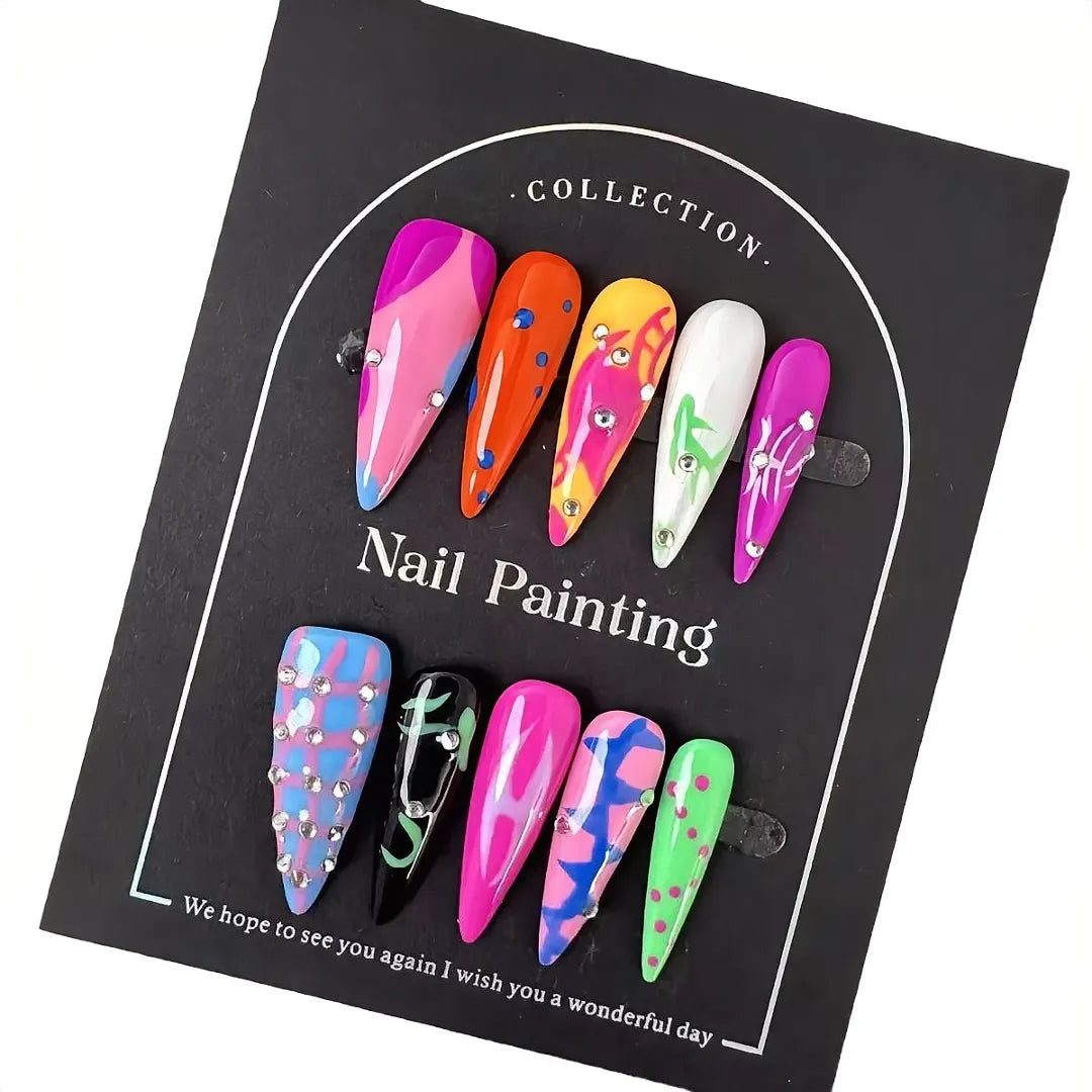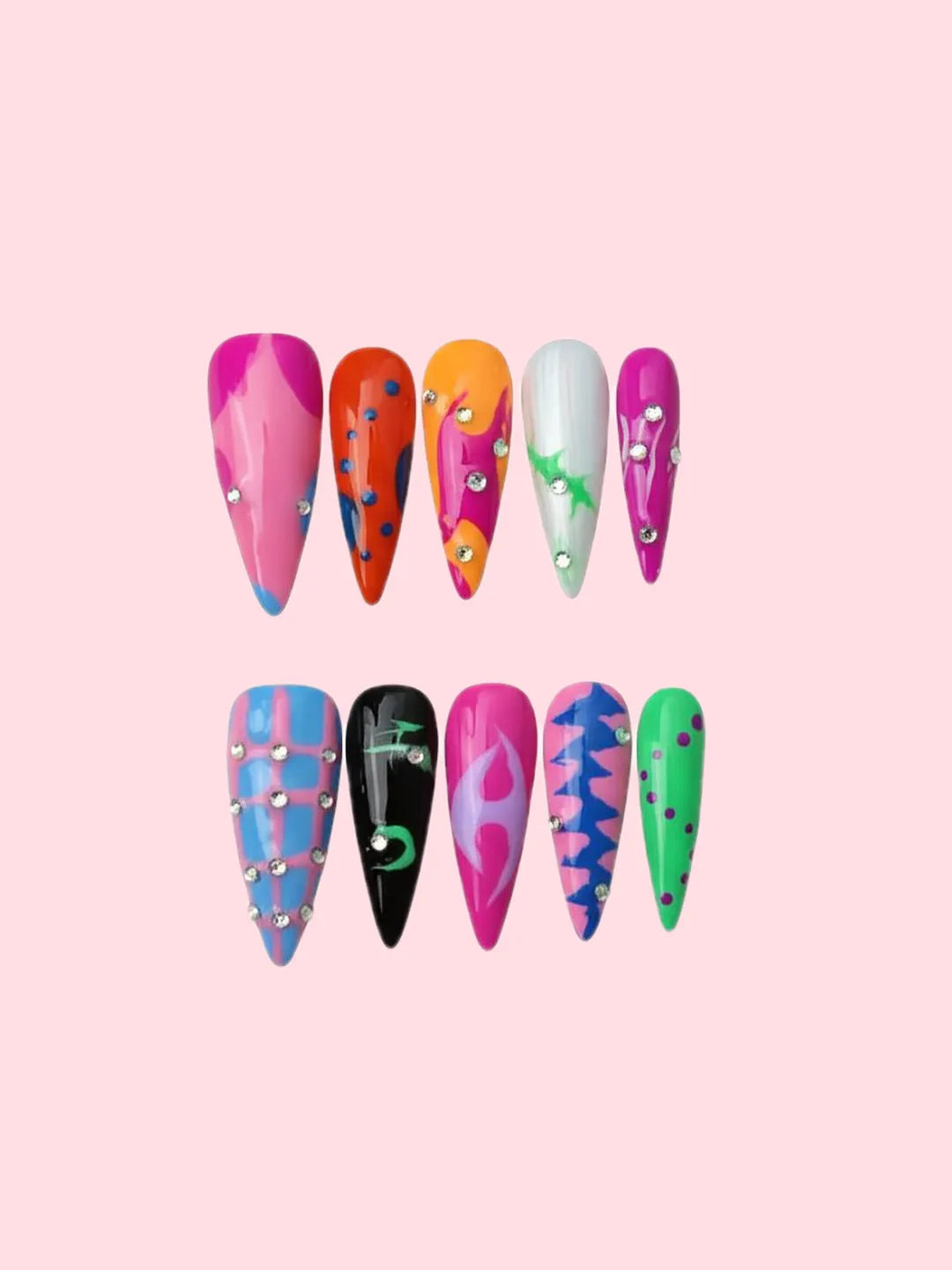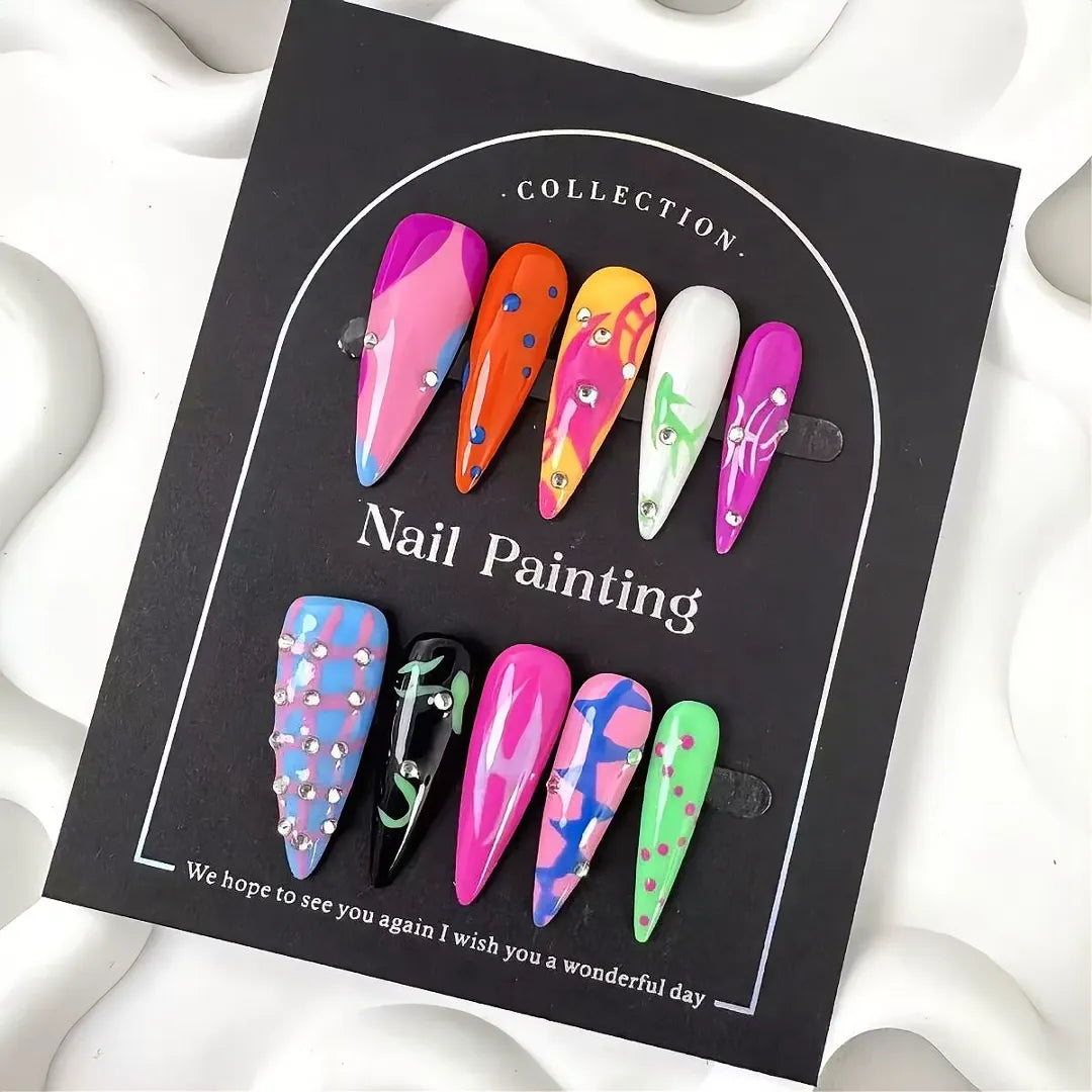 Flame Burst nails feature hand-painted flame motifs with high-contrast colors and refined brushwork, embodying energy and individuality. Each design is handcrafted to perfection, ideal for those who love bold, statement-making looks.
