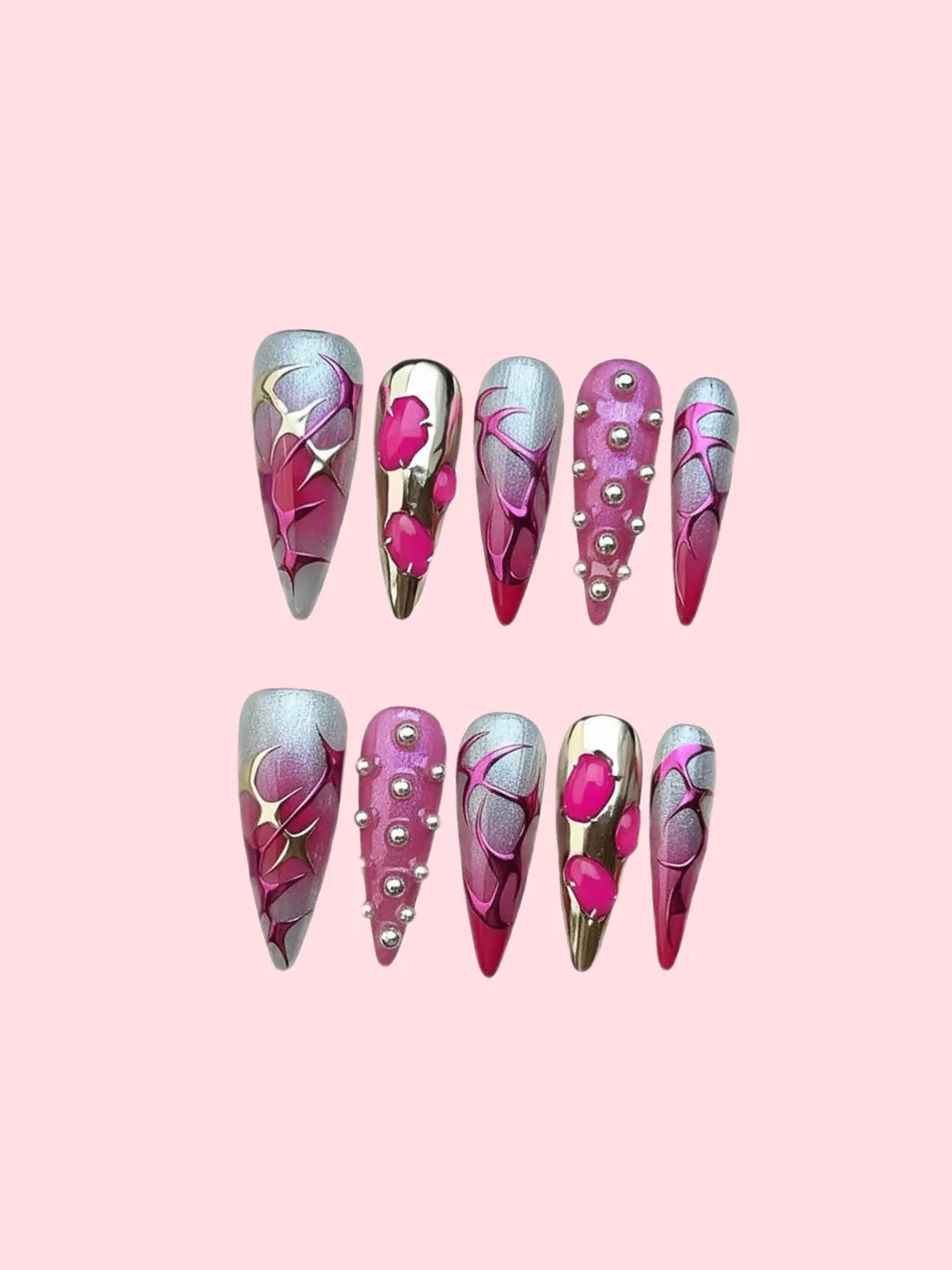 Pink or nude gradient base with 3D hand-carved floral details and subtle shimmer — sweet yet edgy, perfect for daily wear or parties.