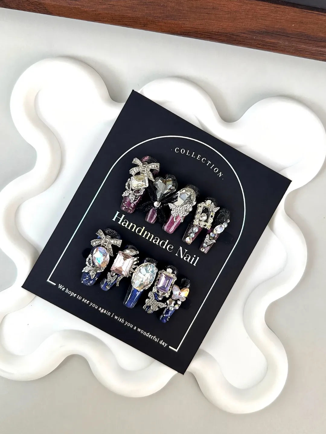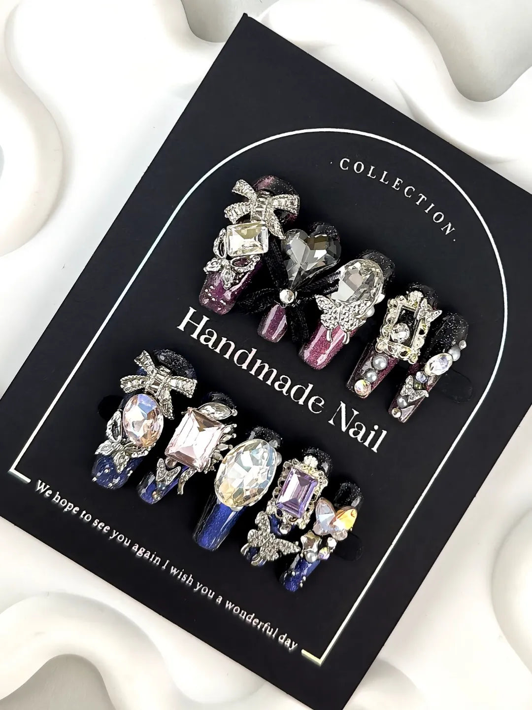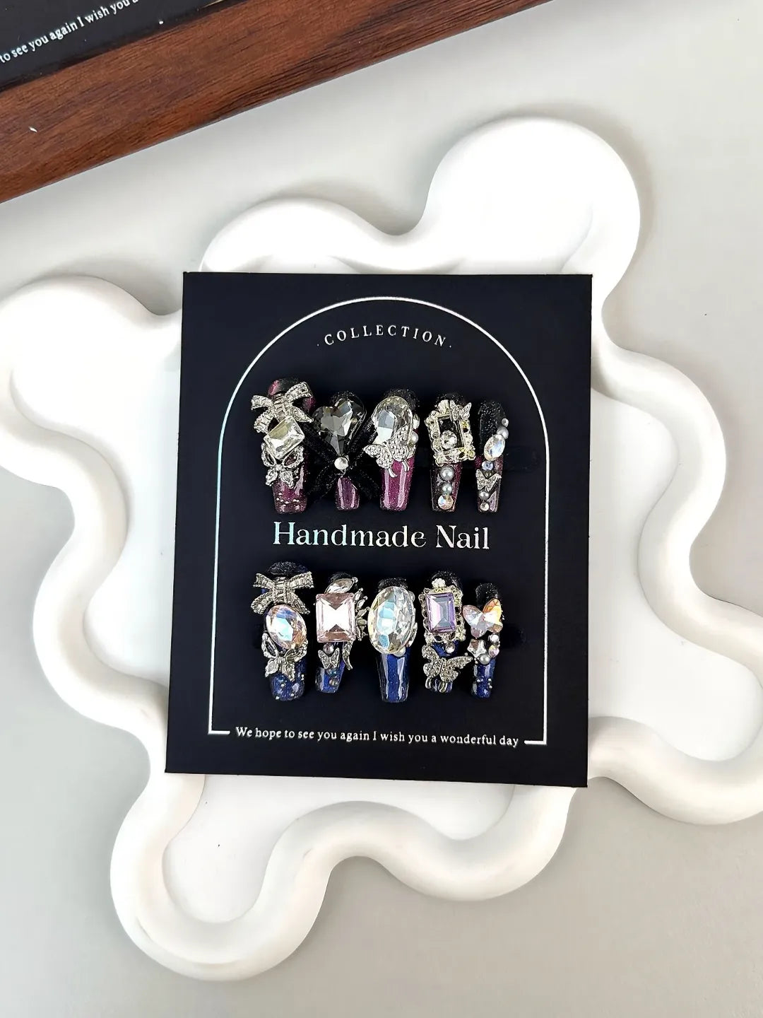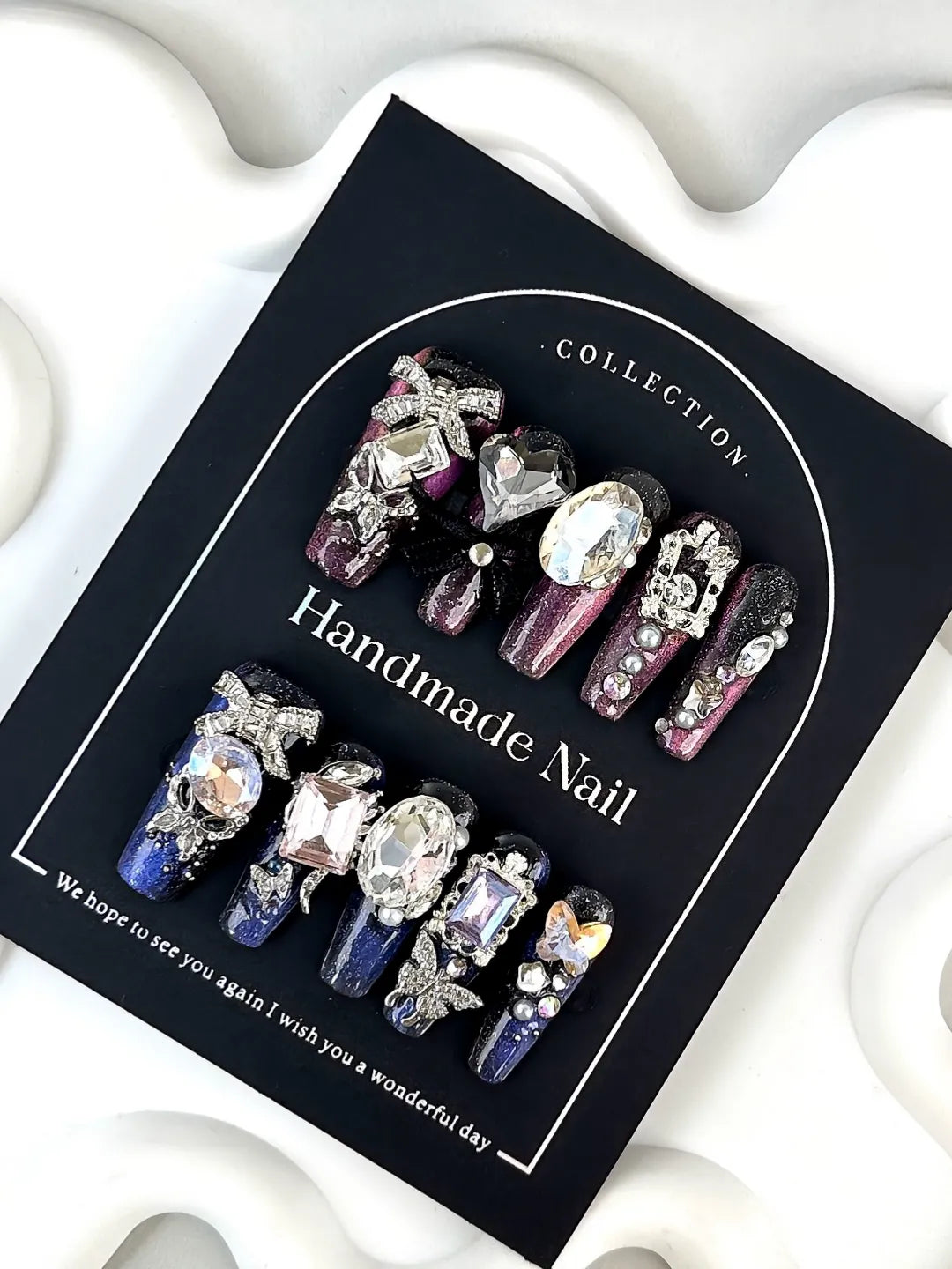GALAXY DIAMOND BOWS nails feature deep galaxy tones with diamond and bow accents, handcrafted long press-ons, dazzling and dreamy, perfect for parties and festive looks.