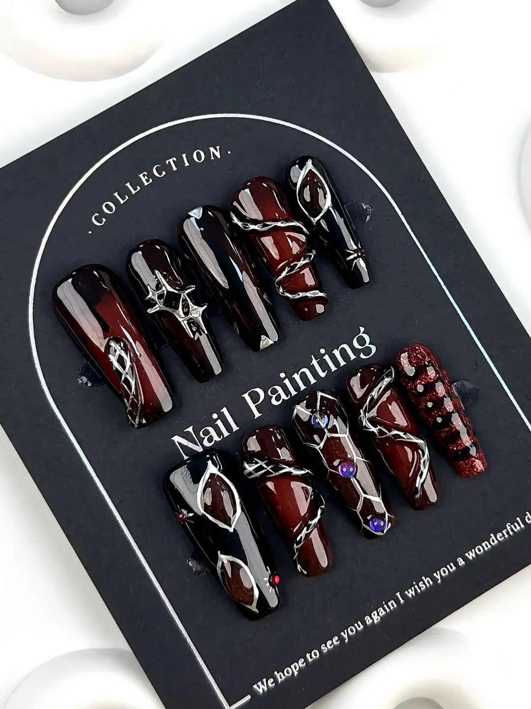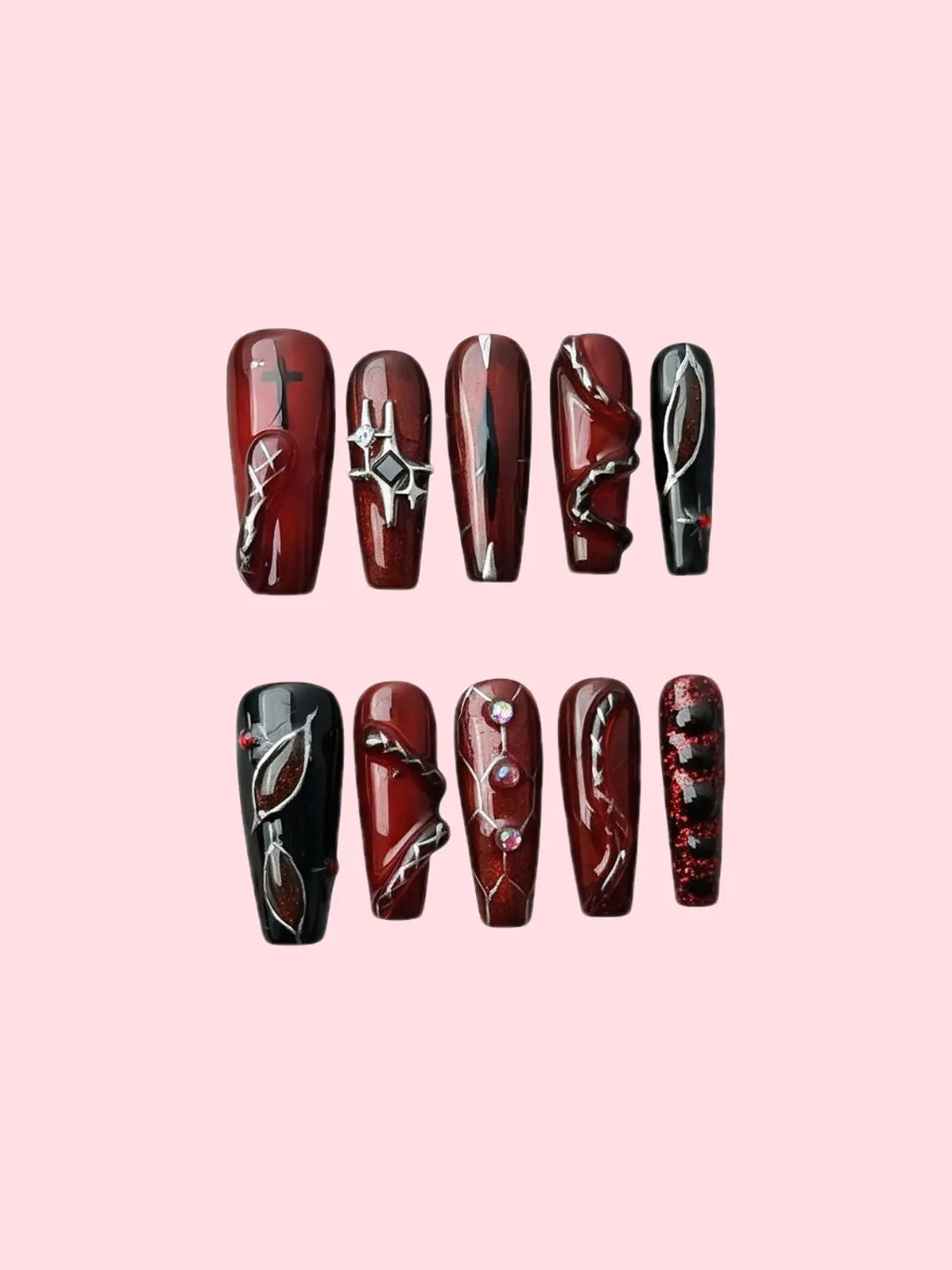 Handmade press-on nails with hand-sculpted elements. Bold, dark, and gothic with red mushroom accents for a mysterious and edgy look.