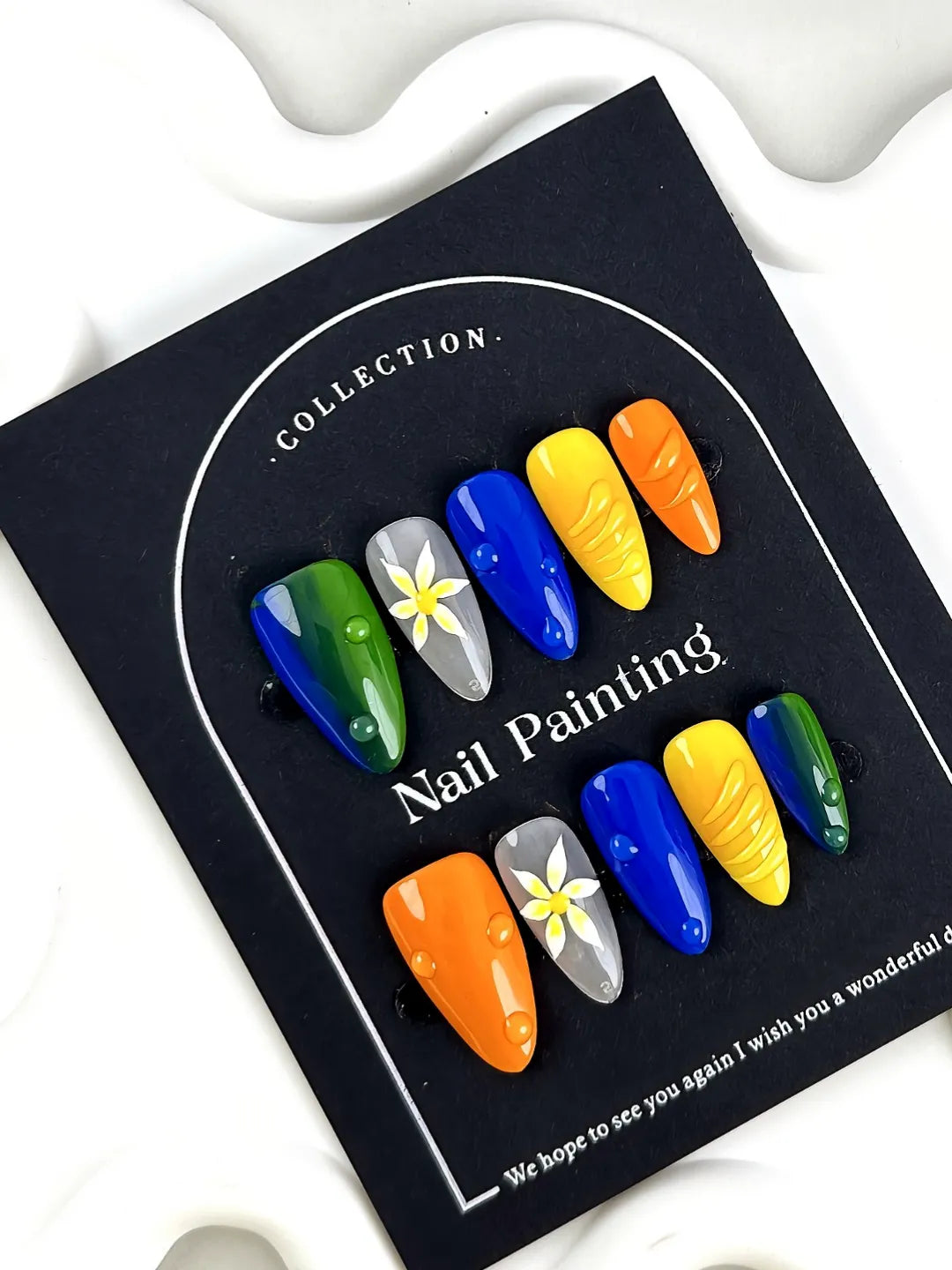 These nails feature bold color-blocking, glossy finish, and 3D water drops with hand-painted flowers. A playful, artistic design full of summer energy.