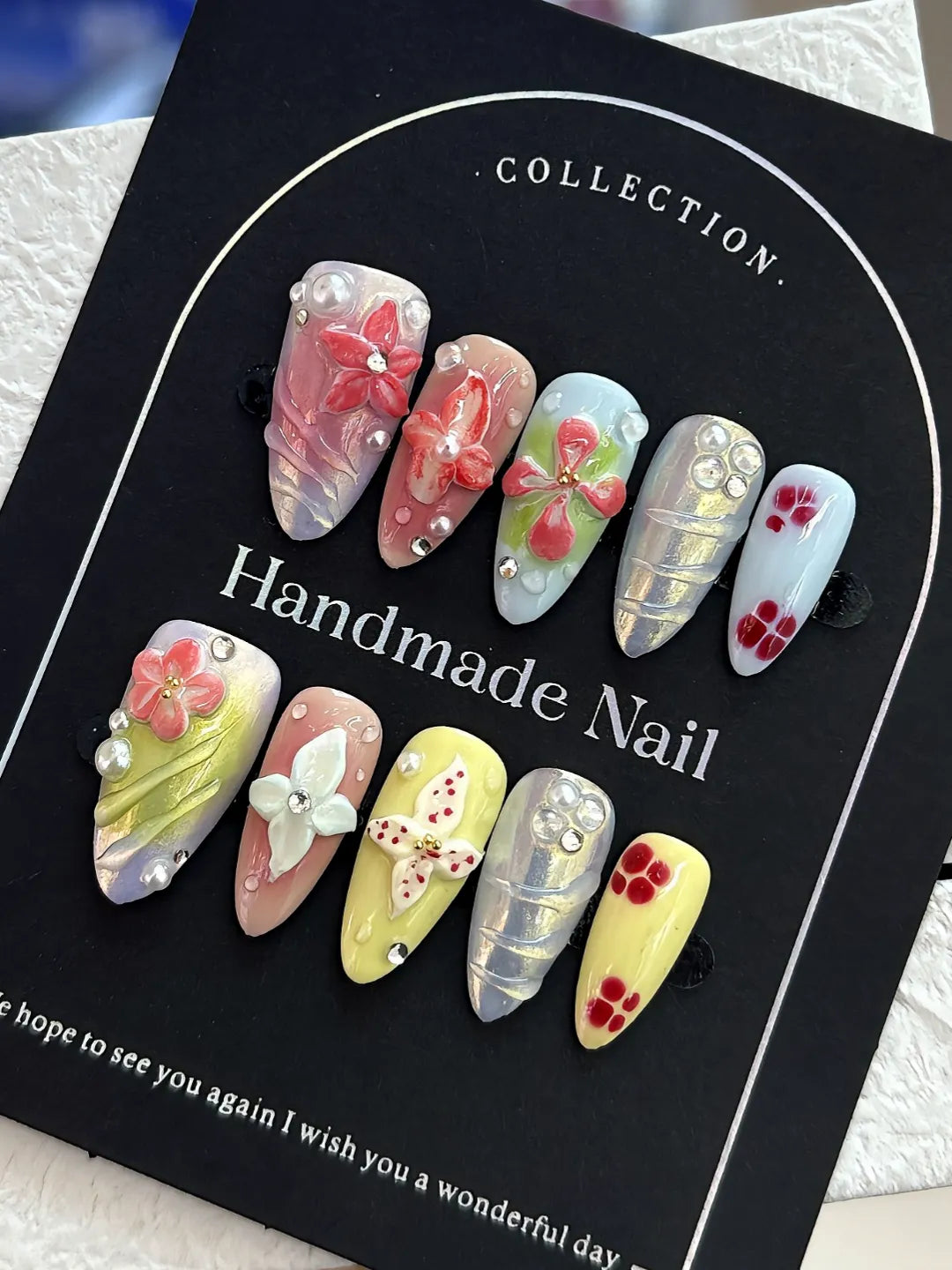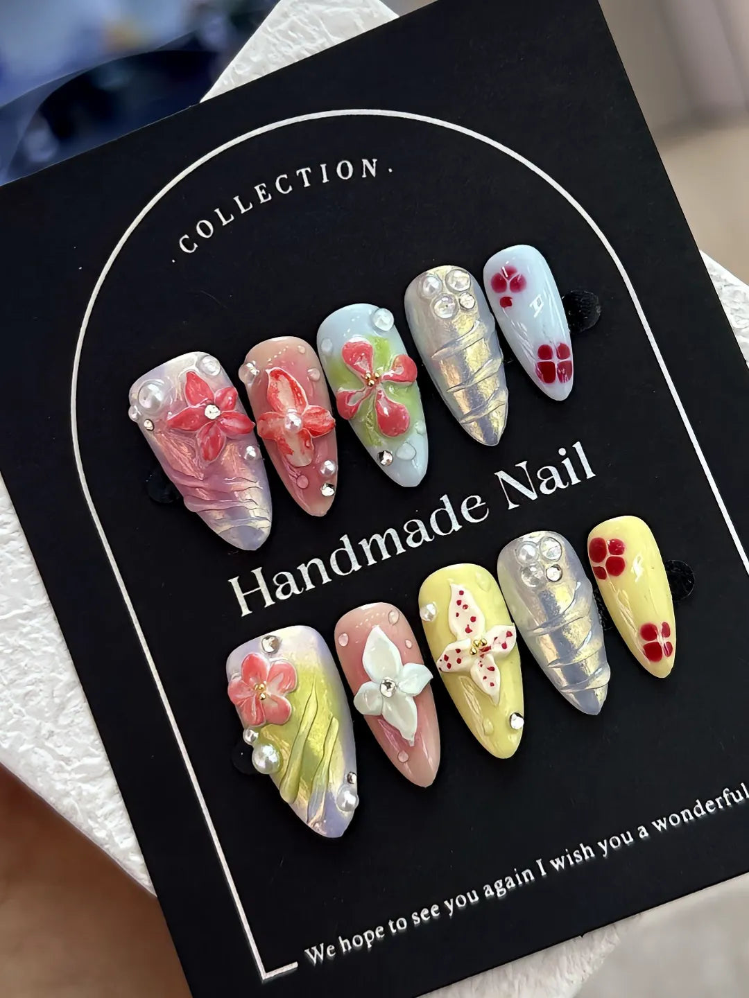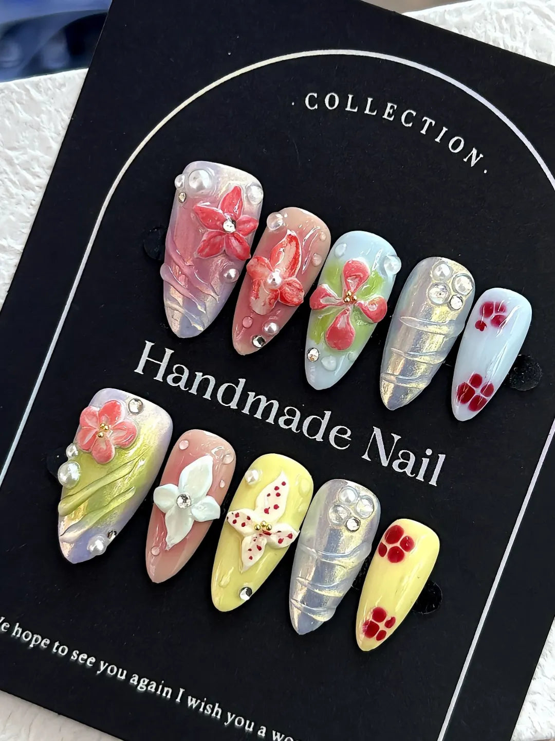 Handmade press-on nails with 3D flowers, pearls, and iridescent shimmer. Bright, whimsical, and perfect for spring and summer looks.