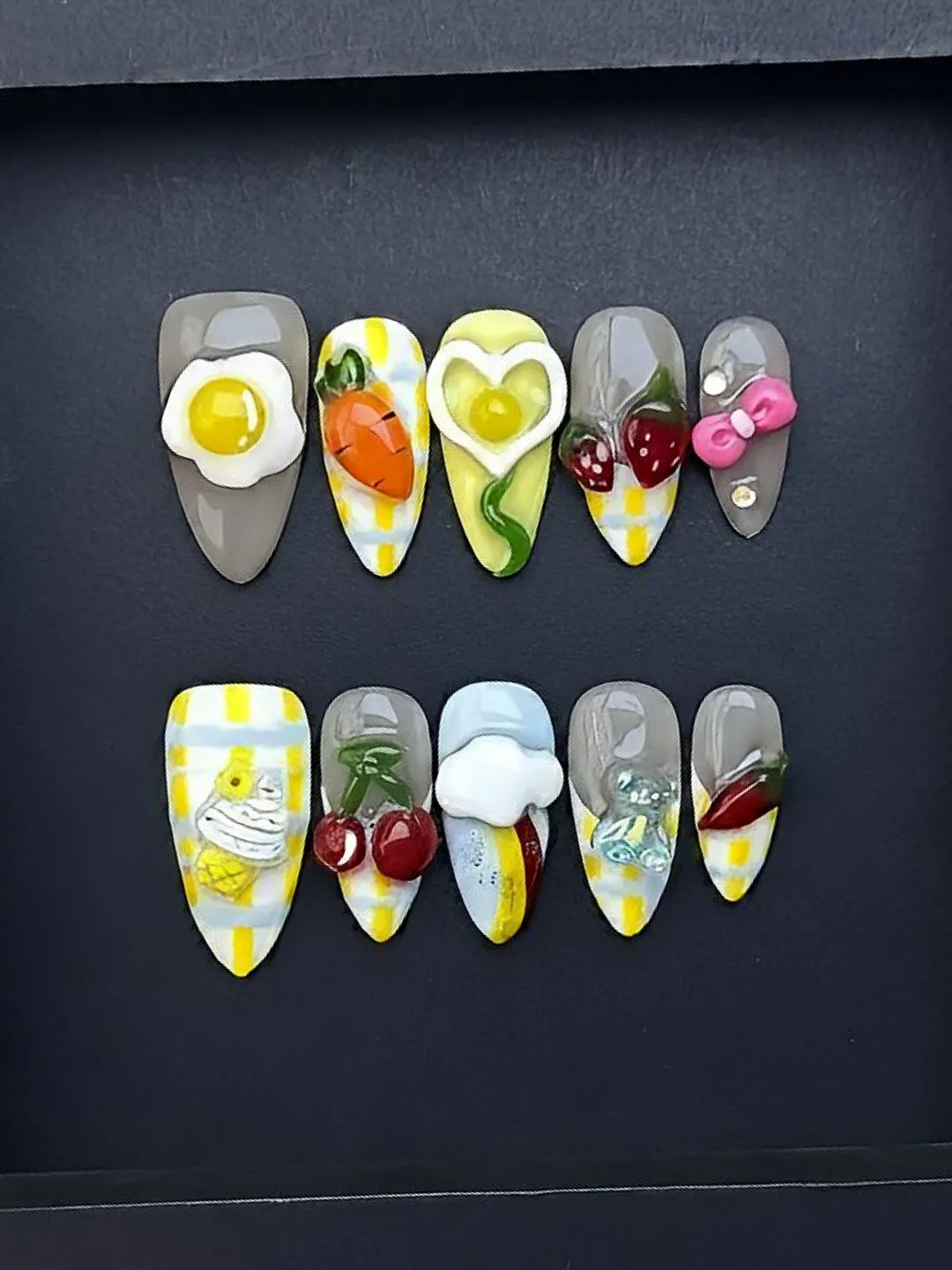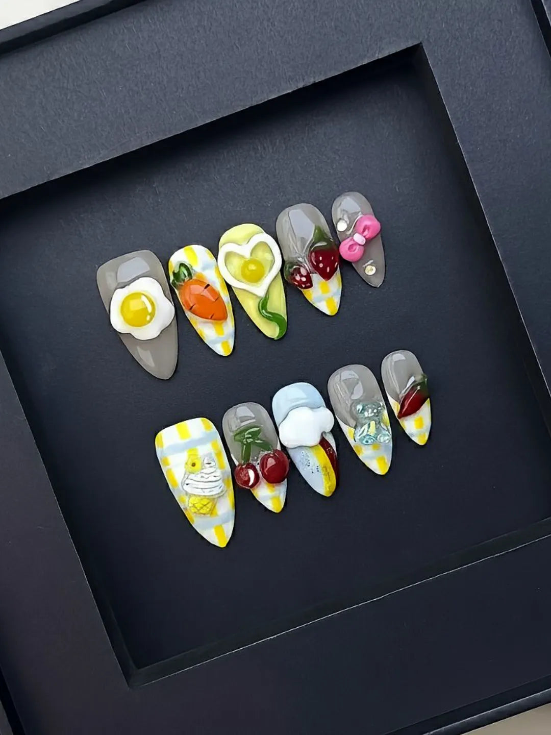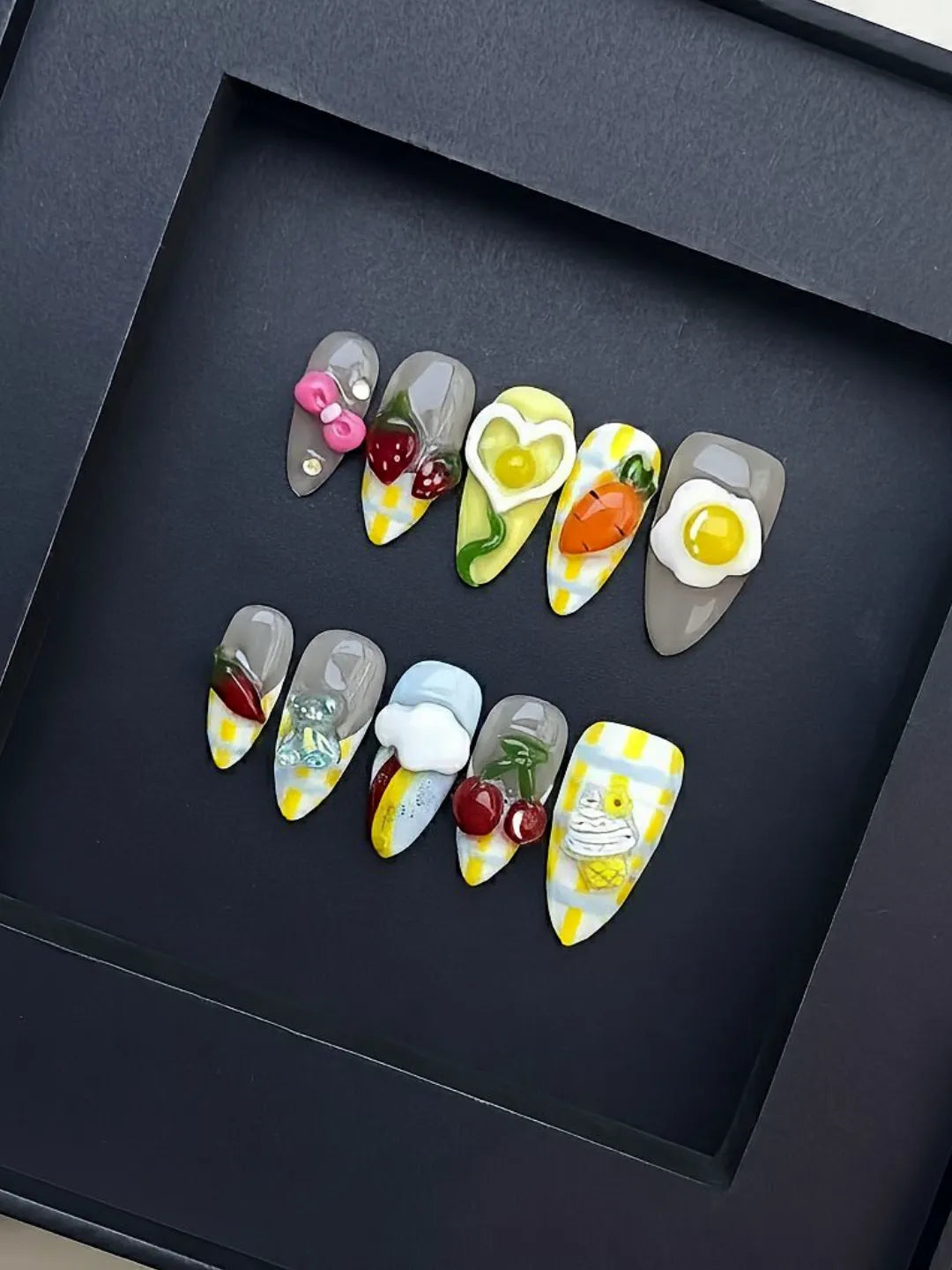 KAWAII FLOWER GARDEN nails feature sculpted 3D flowers, butterflies, and ladybug charms. Handcrafted on short round tips, this set blends cute Korean/Japanese style with Western edginess for a summer luxury look.