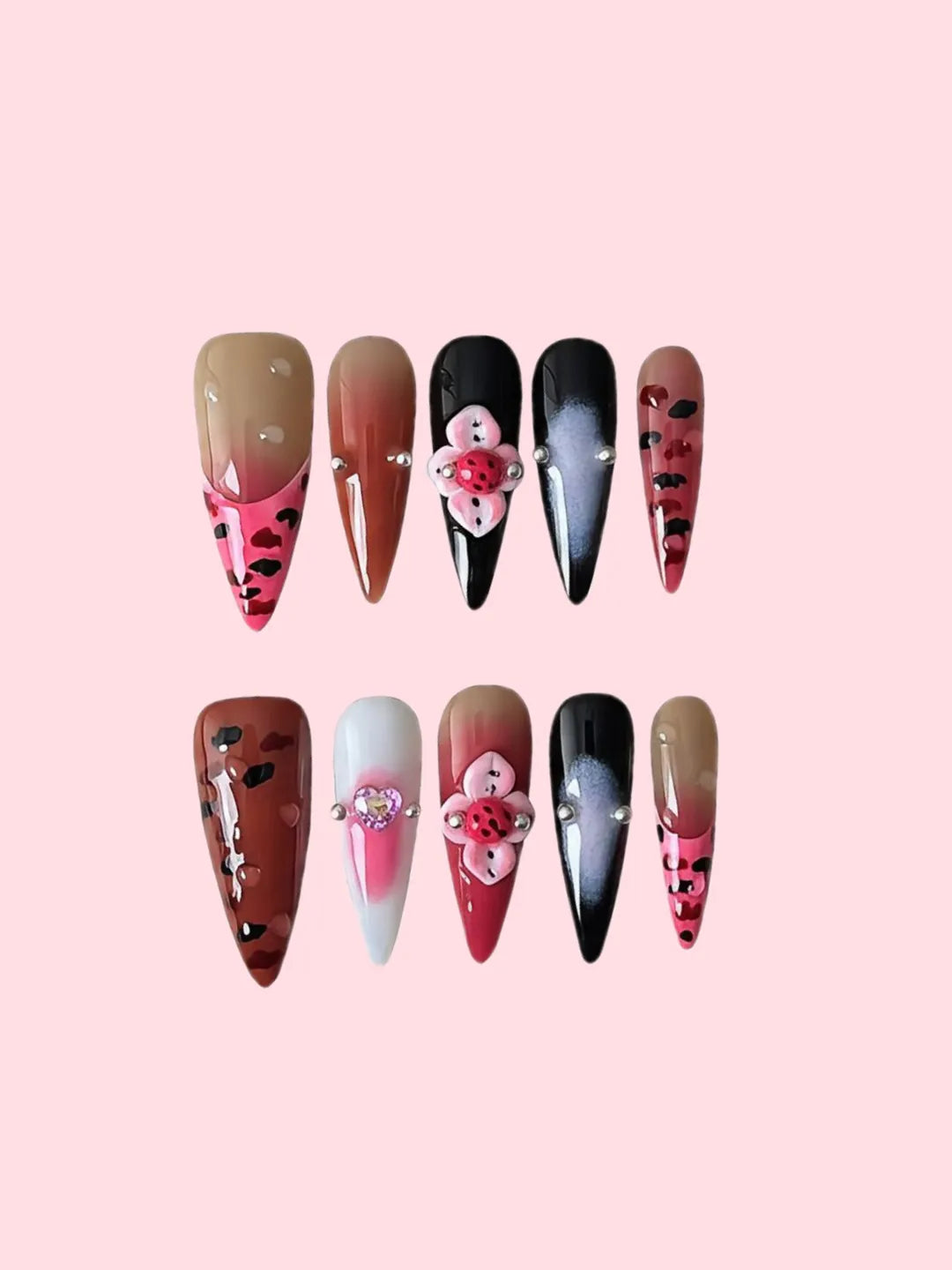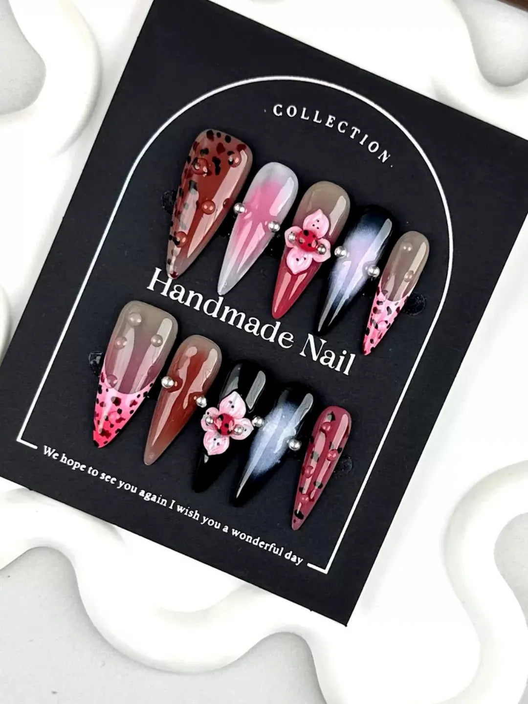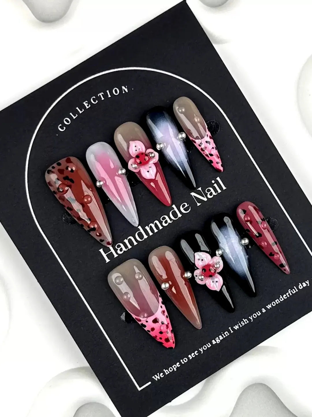 Warm gradient or nude base with hand-painted leopard patterns and 3D carved details β bold yet refined, perfect for daily wear or parties.