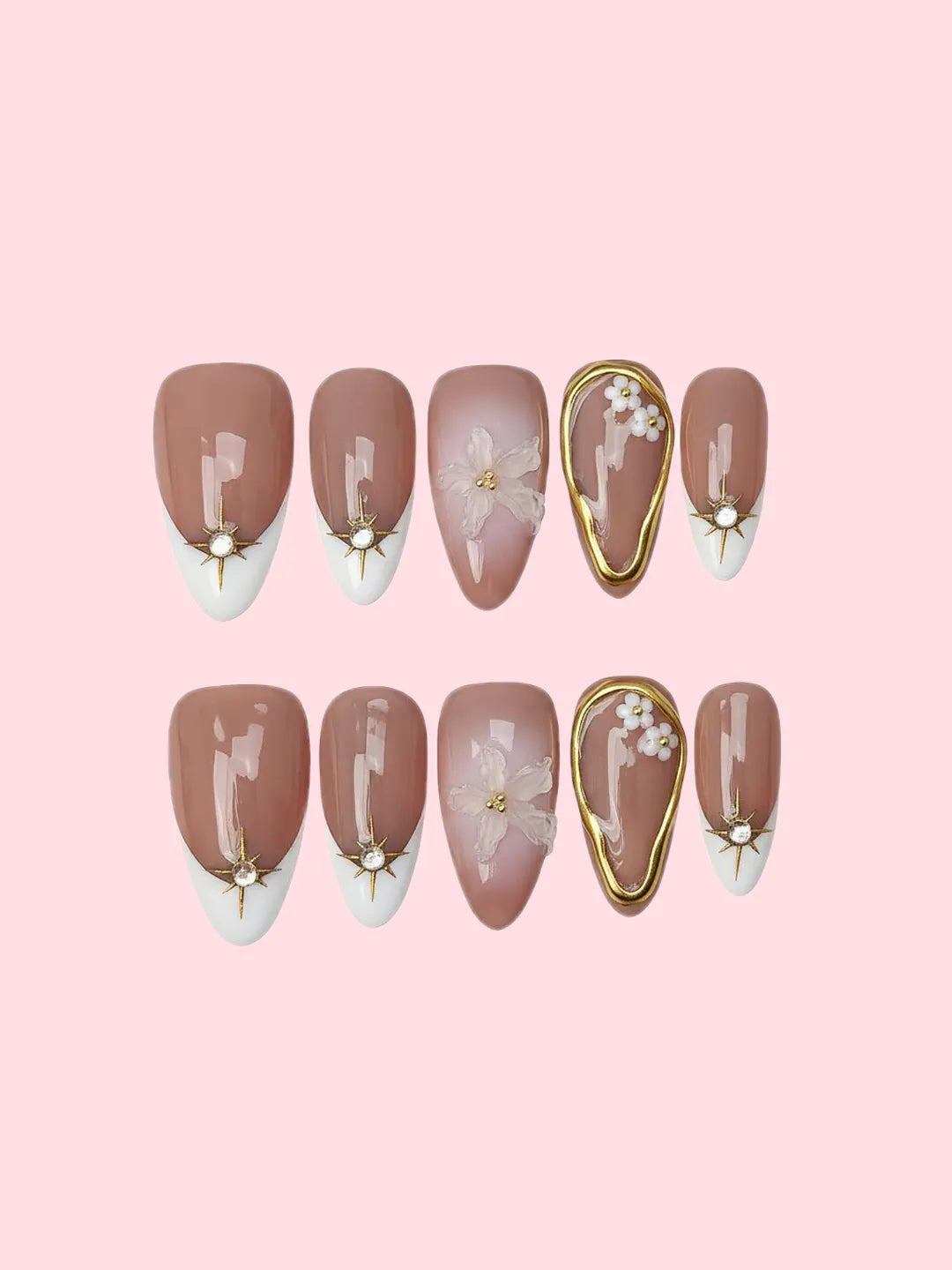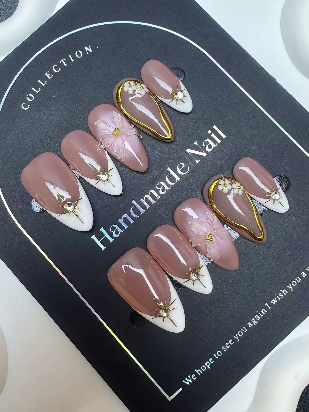 Handmade press-on nails with soft nude tones, French tips, gold accents, and delicate 3D flowers. Elegant, chic, and perfect for sophisticated looks.