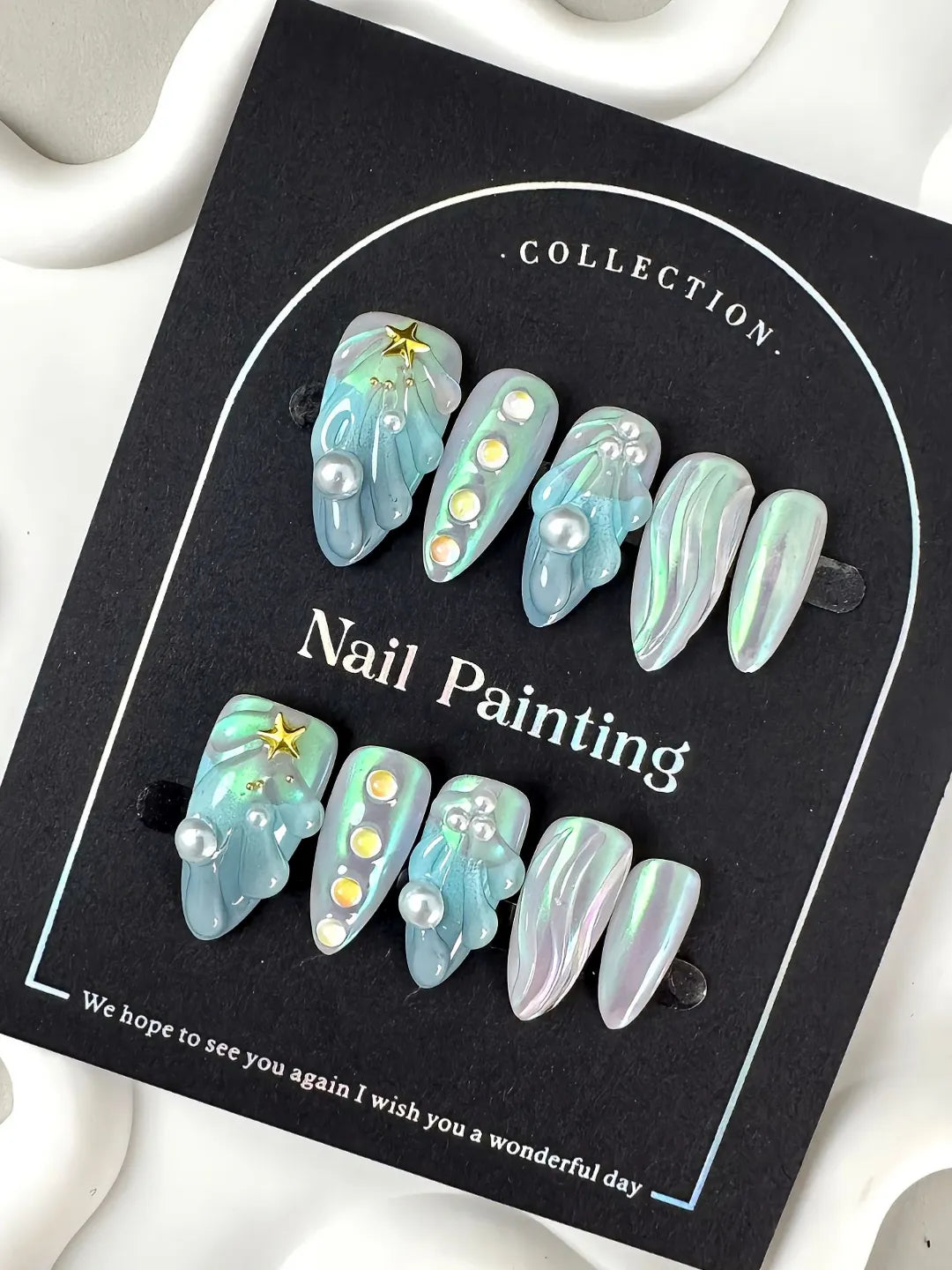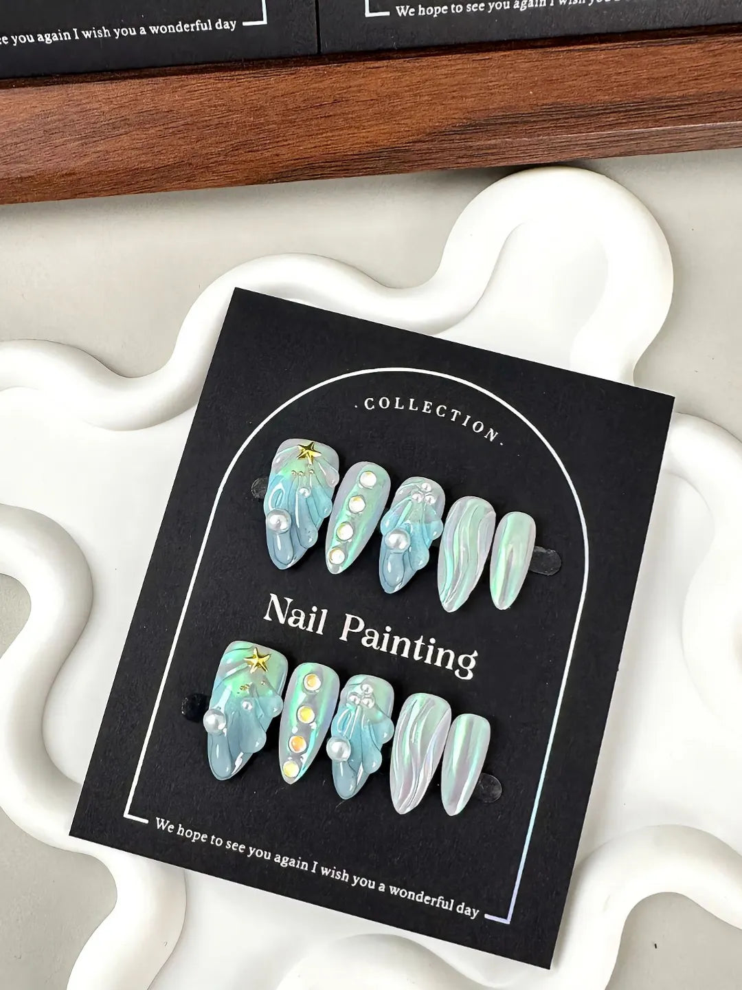 Ocean Shell nails feature blue gradients with delicate shell details, creating a fresh seaside vibe, perfect for daily wear or vacations.