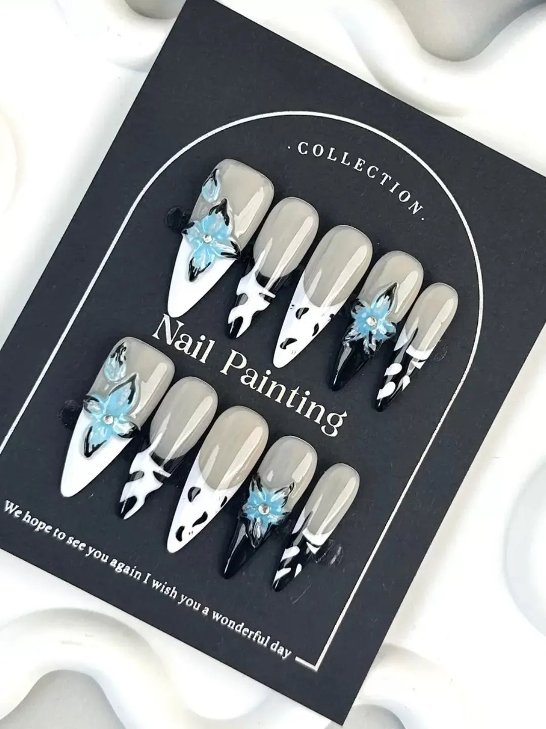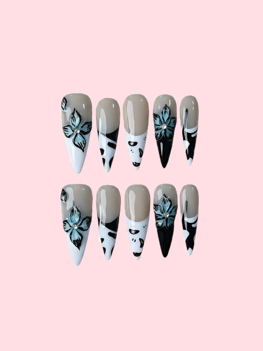 Light or nude gradient base with 3D hand-painted petals and subtle shimmer — romantic and elegant, perfect for daily wear or dates.
