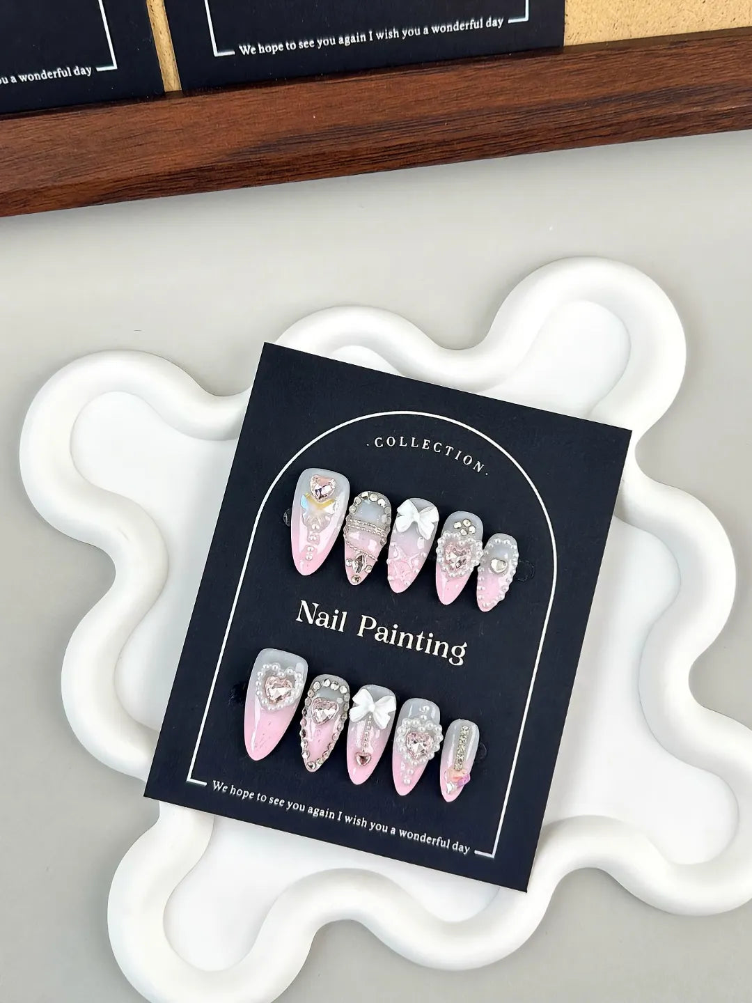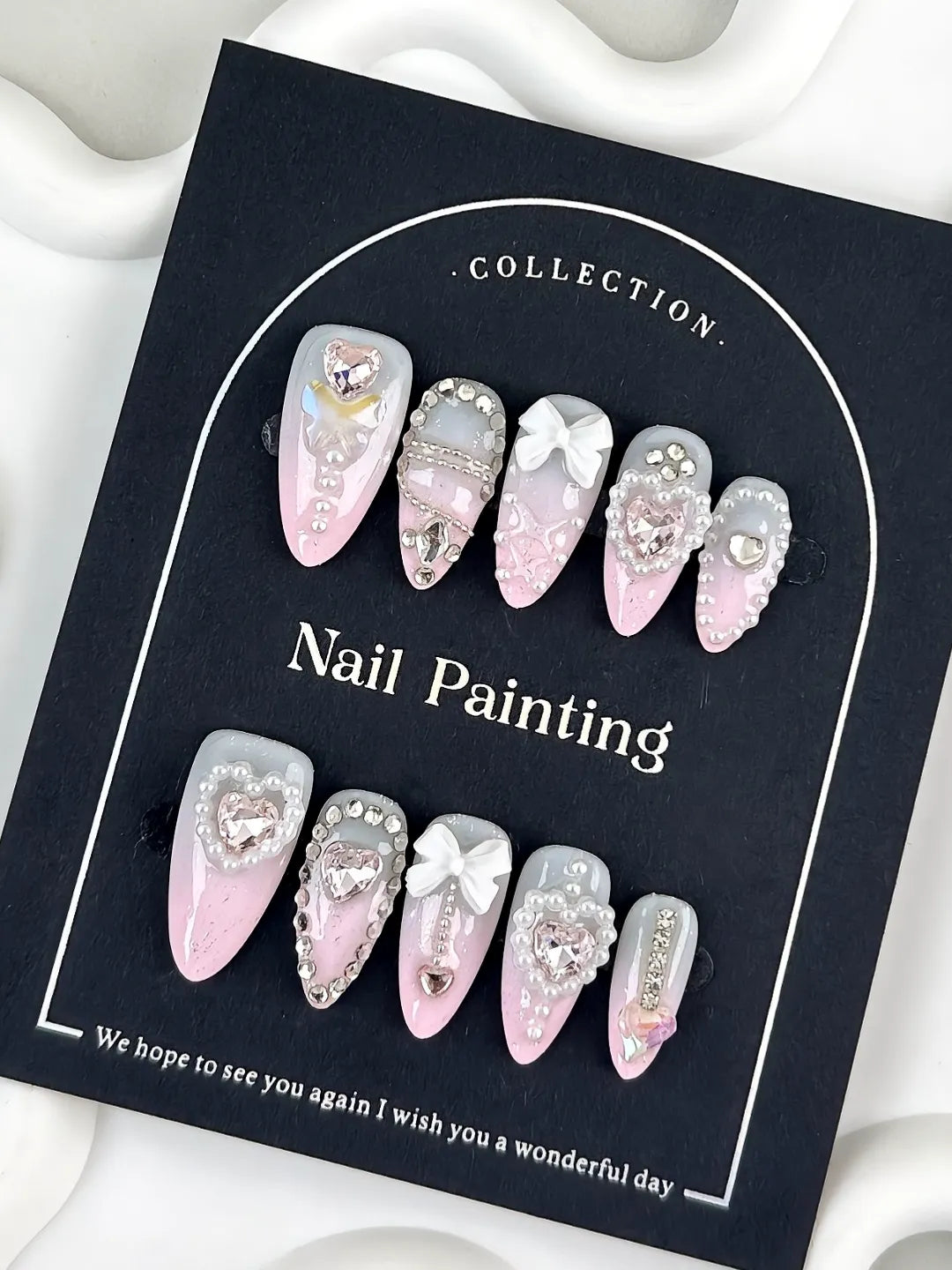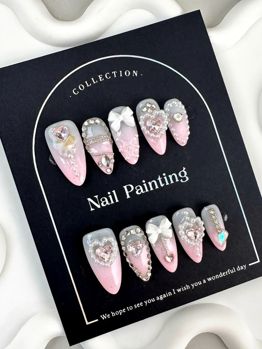 Medium almond nails with soft gray-blue & pink-lilac ombré, glitter accents, 3D gems, pearls, bows, and heart charms. Cute, romantic, and kawaii luxury.