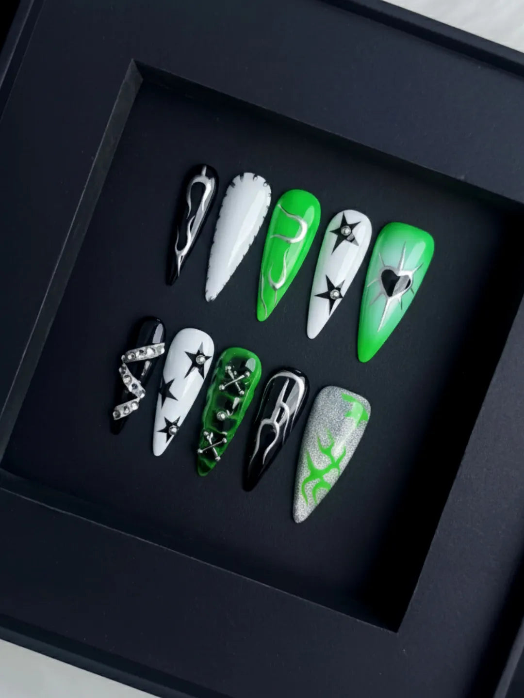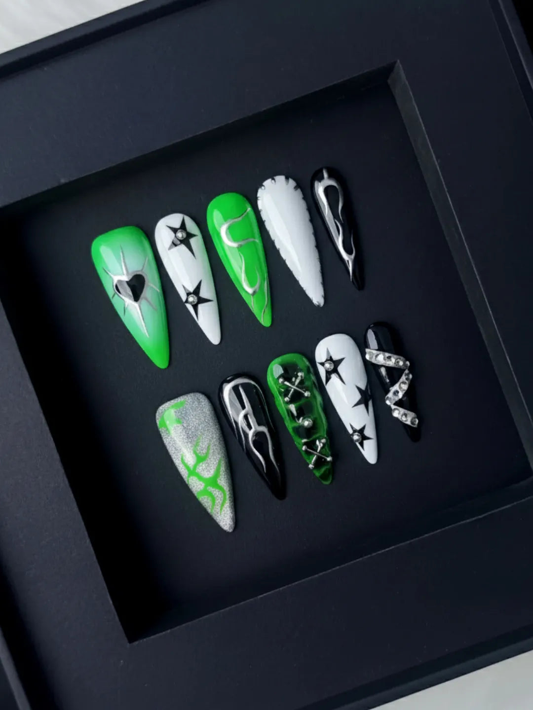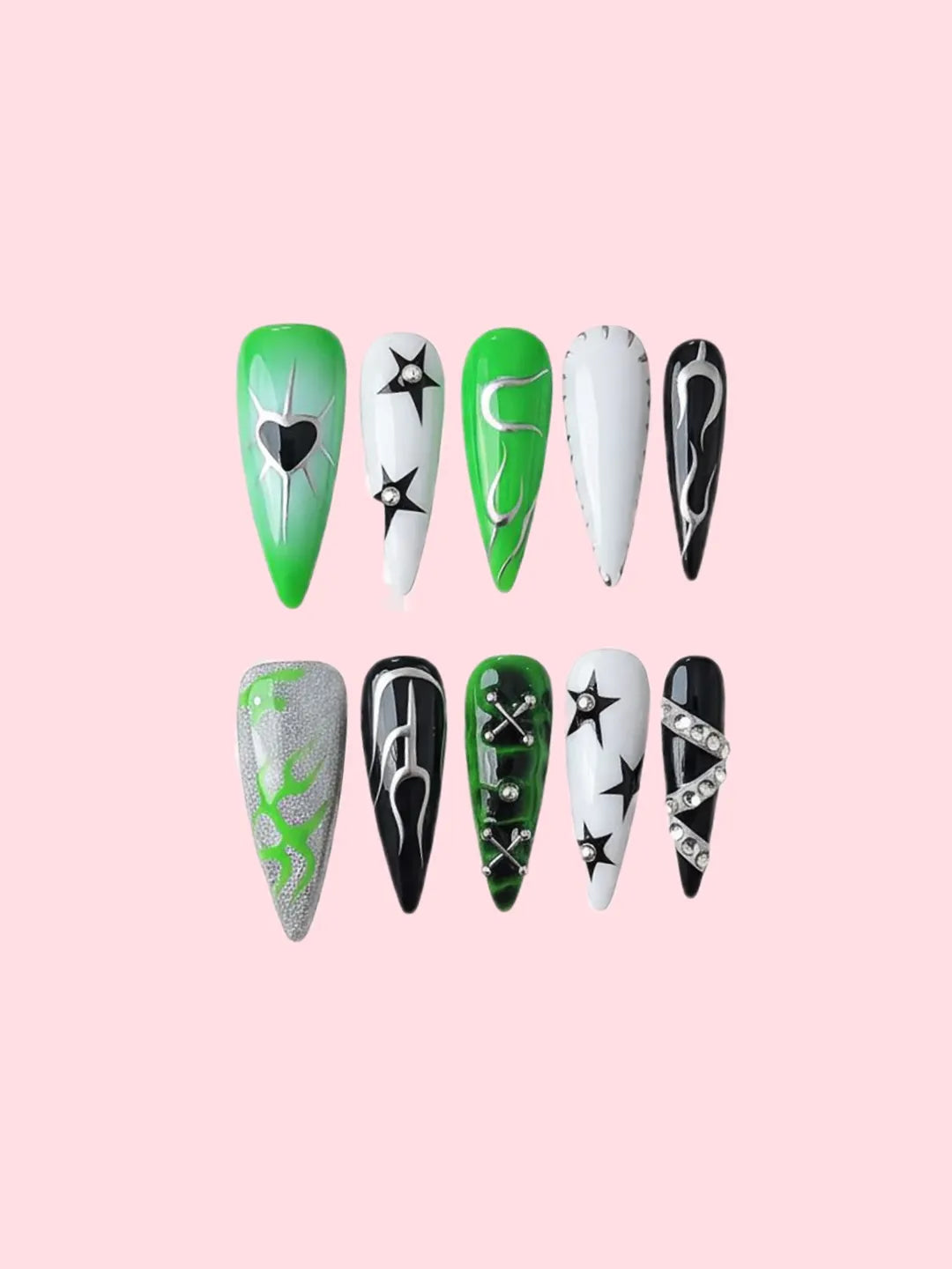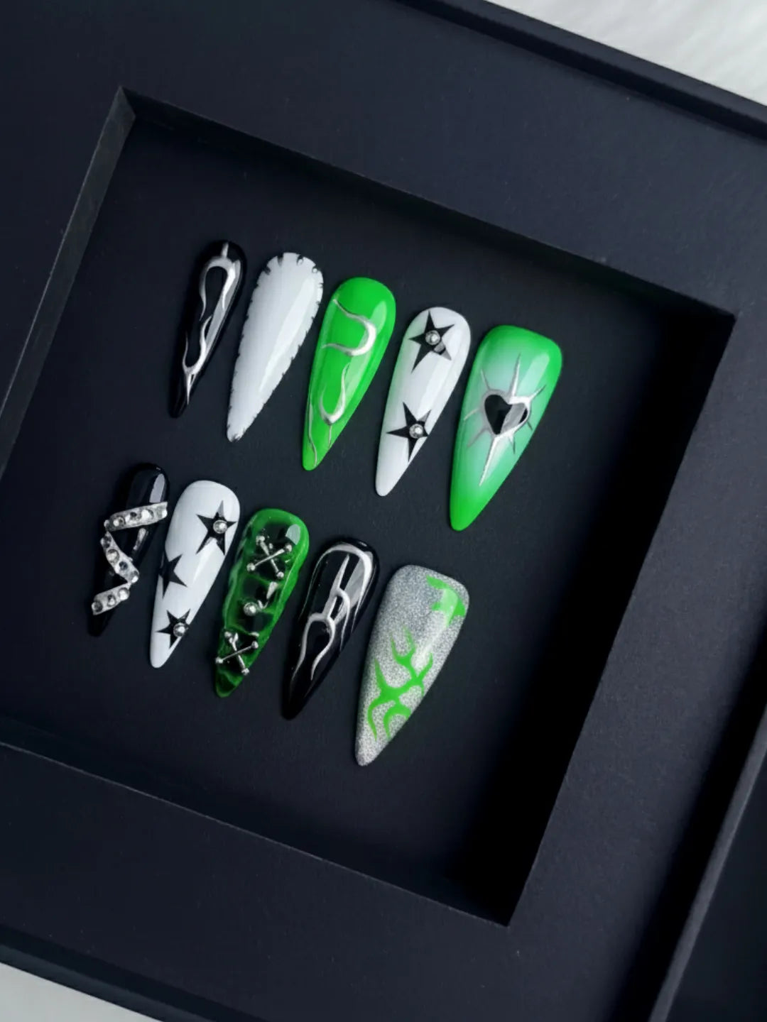 Green base with black and silver accents, featuring hand-painted hearts — sweet yet edgy, perfect for daily wear or parties.