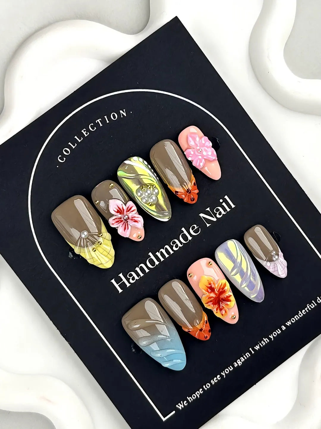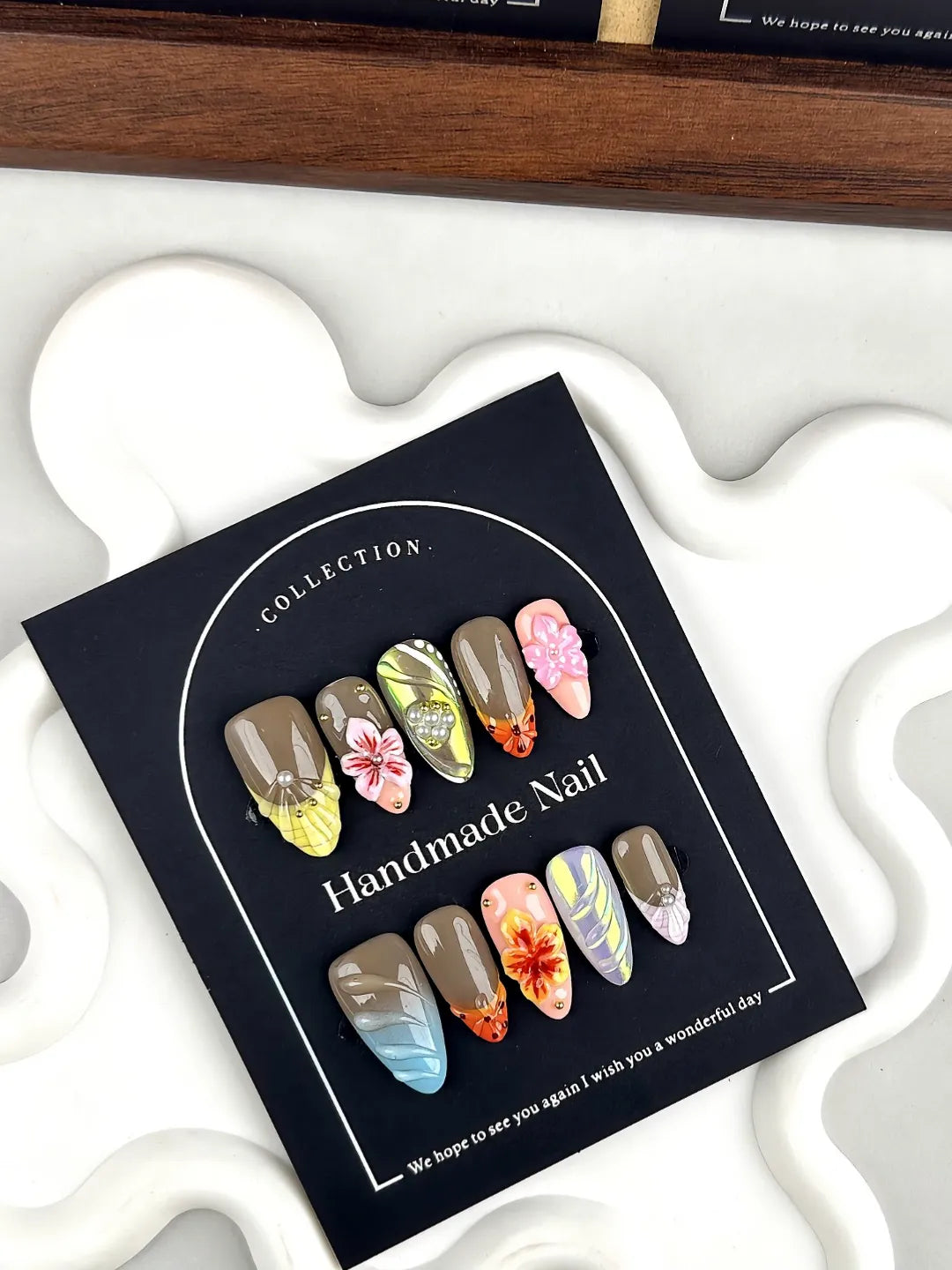 SAVANNAH SUNSET nails feature sunset gradient tones with handcrafted carvings, short and easy to wear, offering warm and elegant vibes, perfect for spring-summer everyday or party looks.