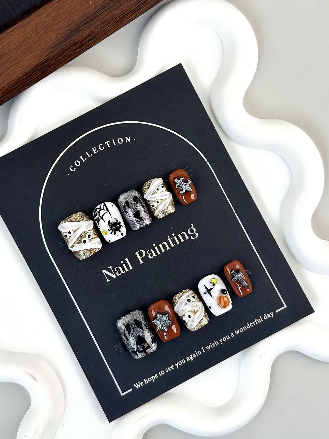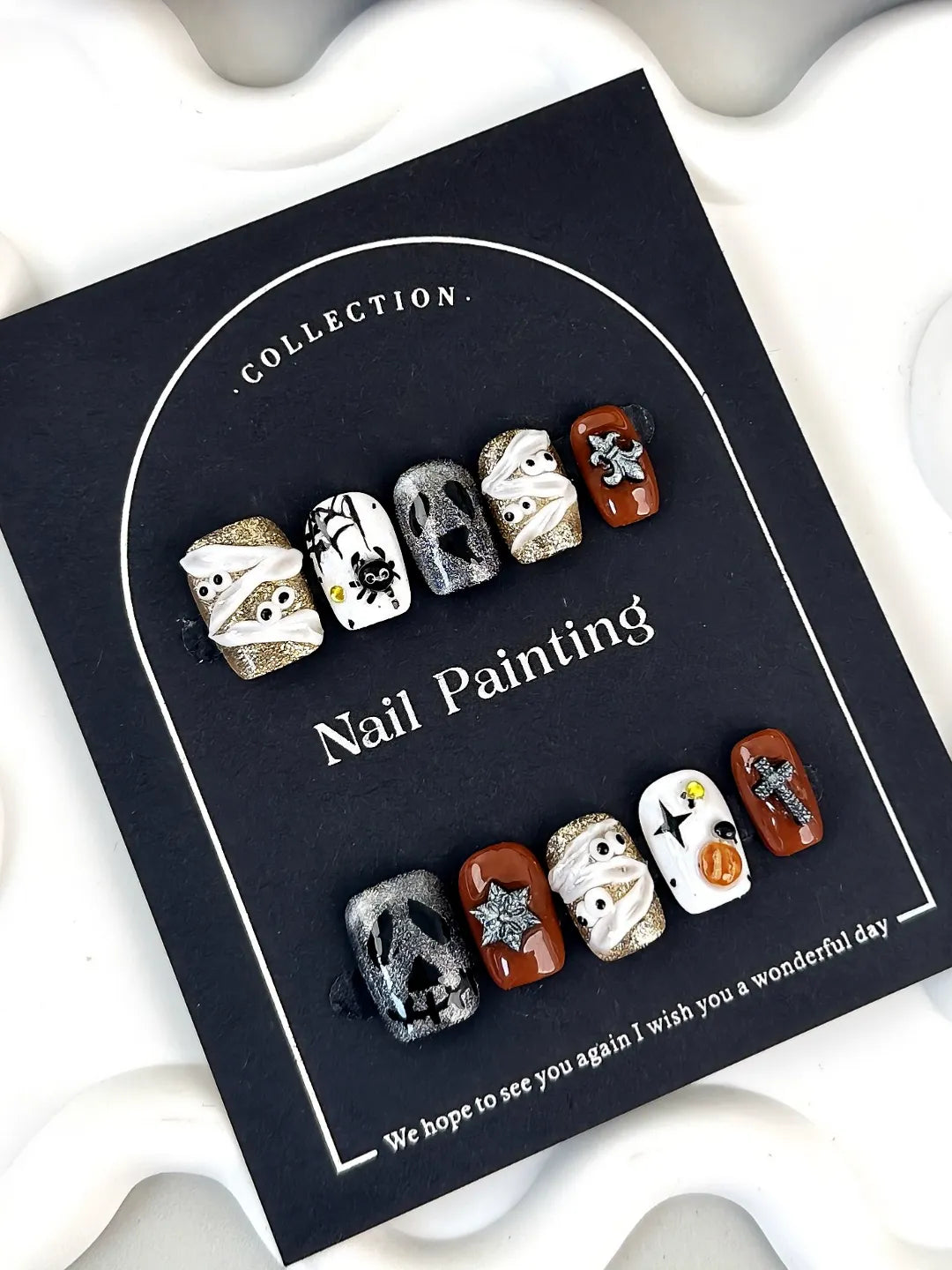 Short squoval nails with mummy wraps, spiderwebs, jack-o'-lanterns, skulls, and 3D charms. Cute, festive, and perfect for Halloween.