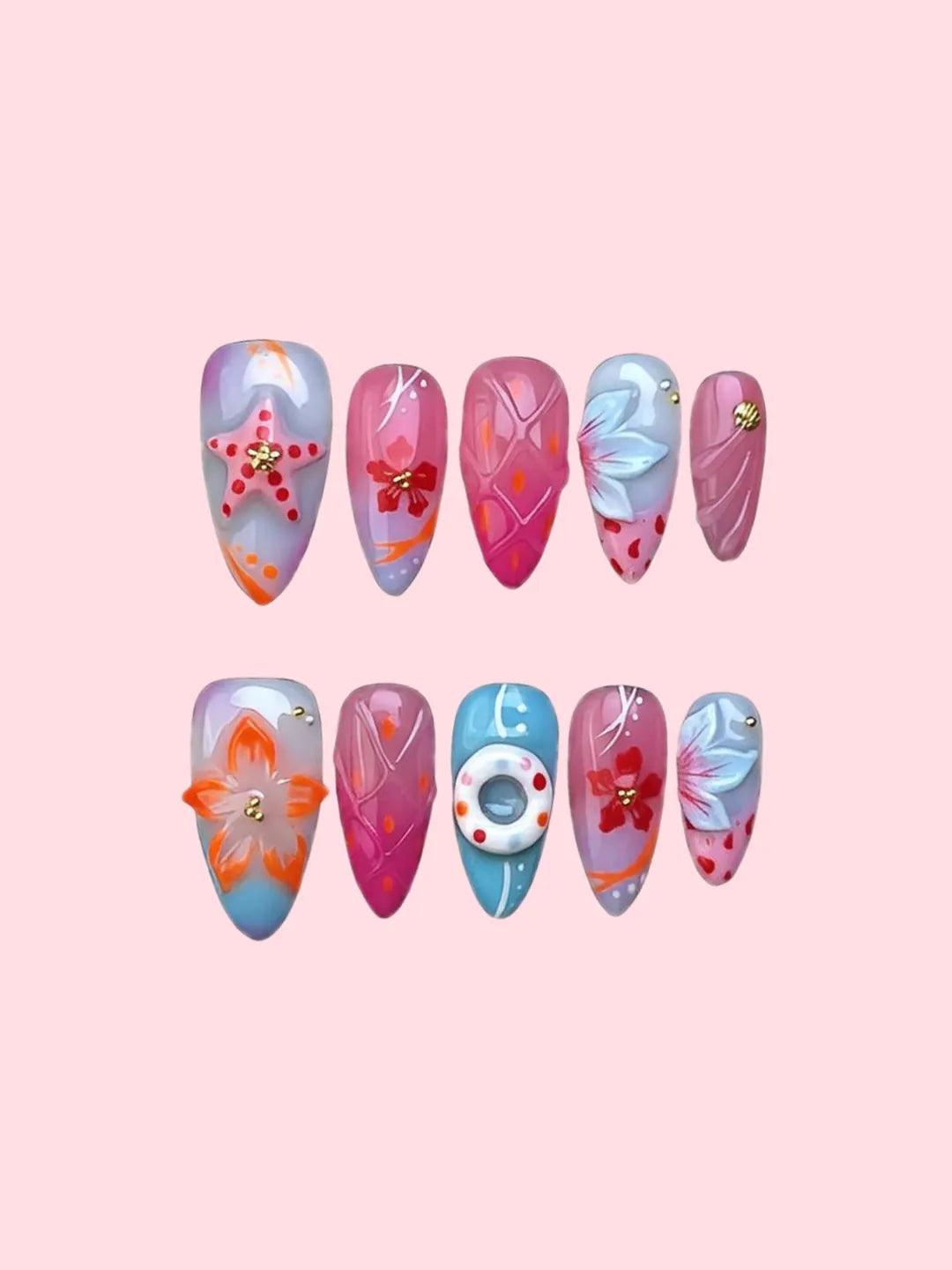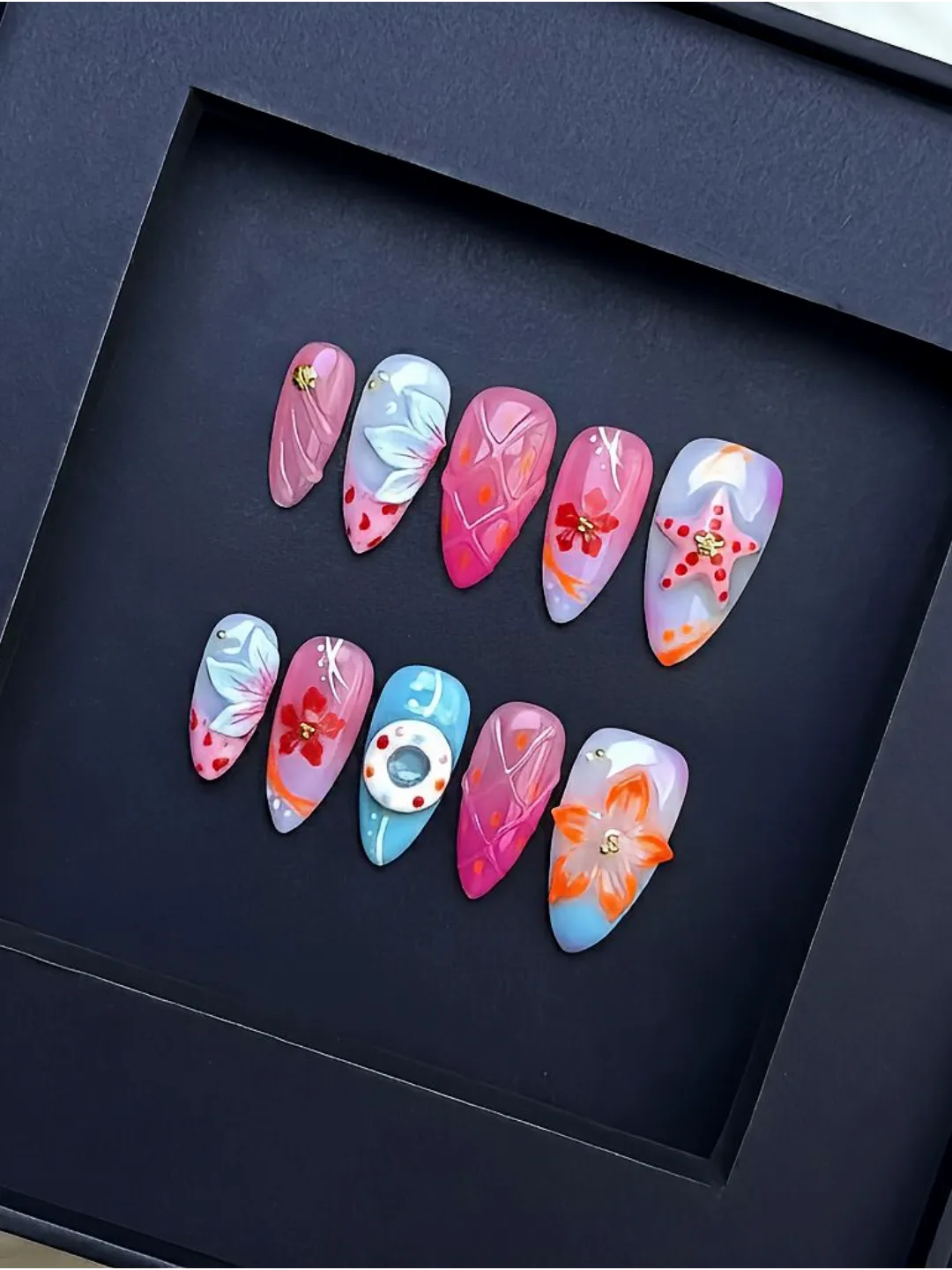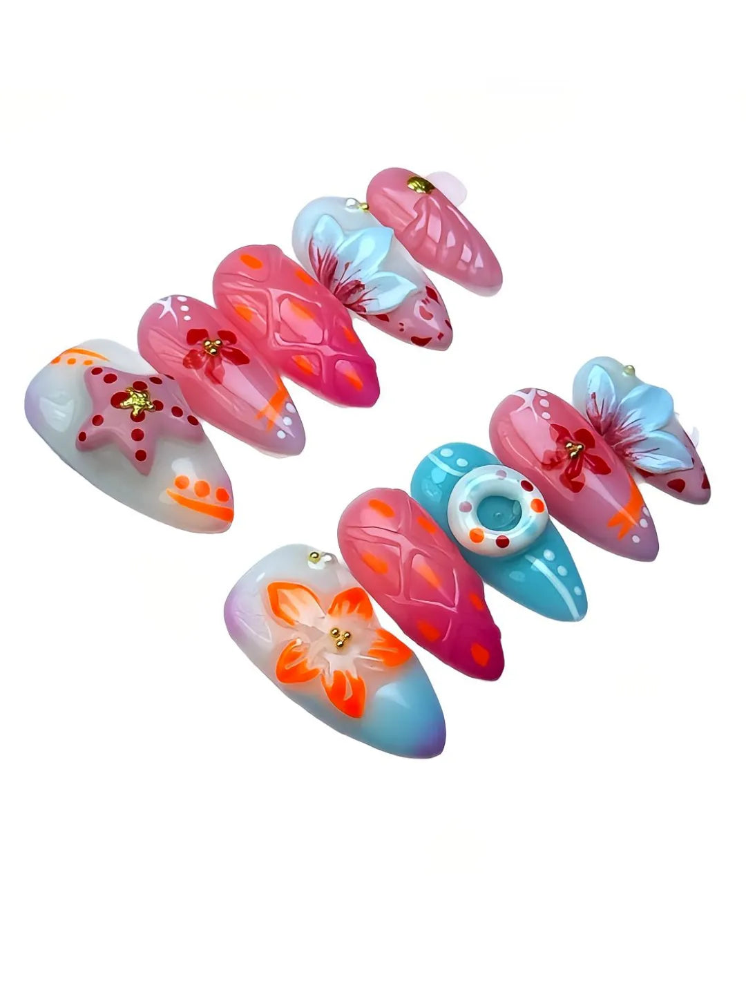 STARFISH SPLASH nails feature handcrafted carvings with seashell accents on short nails, fresh and natural, easy to wear, perfect for spring-summer and beach looks.