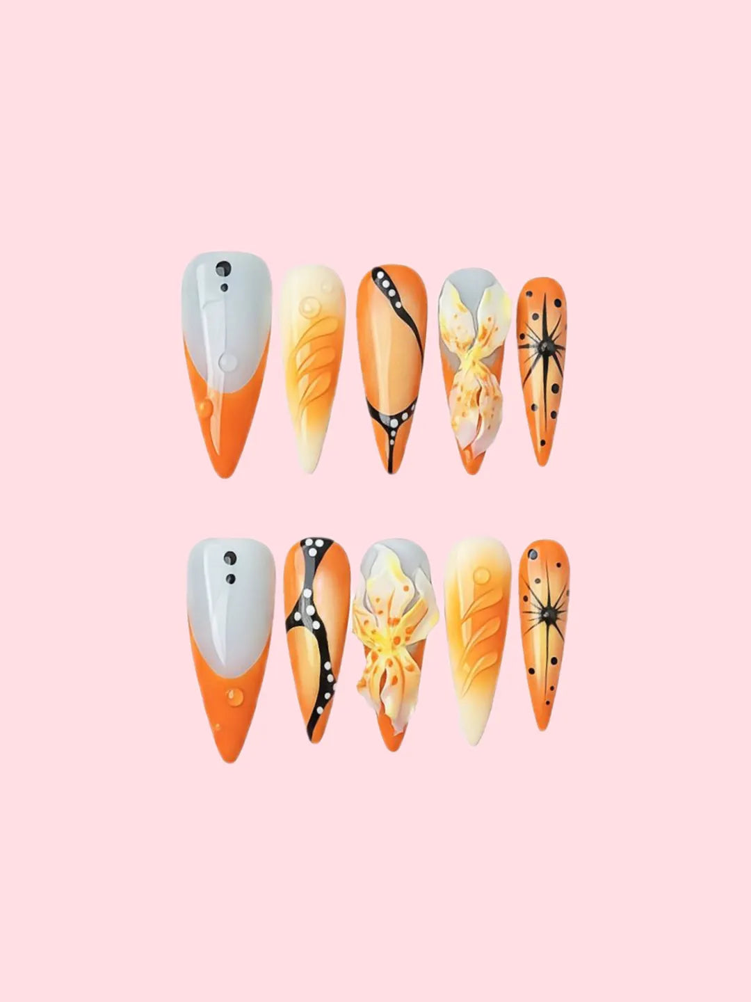 SUNLIT BLOOM DANCE nails feature an orange-white gradient with 3D flowers and flowing accents, handcrafted for a bright, elegant, and summery luxury vibe.