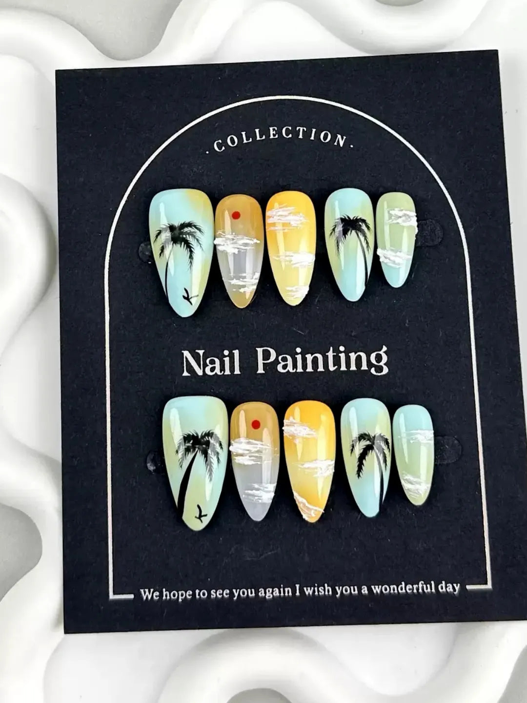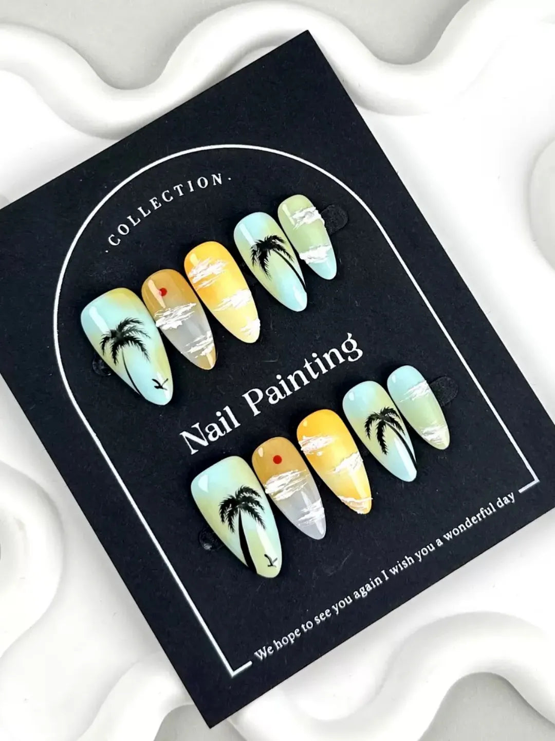 Gradient orange or peach base with hand-painted coconut trees and subtle shimmer — warm and romantic like a sunset, perfect for summer beach or daily wear.