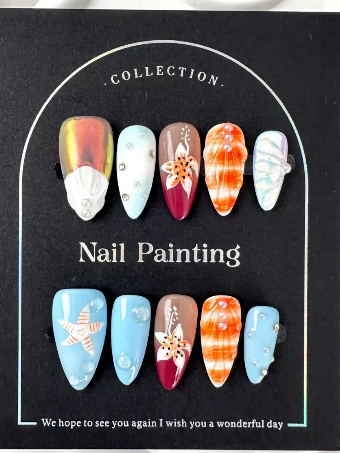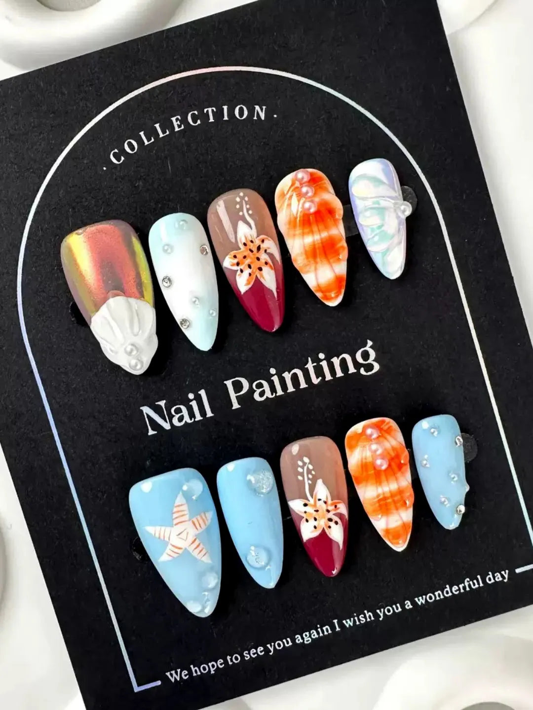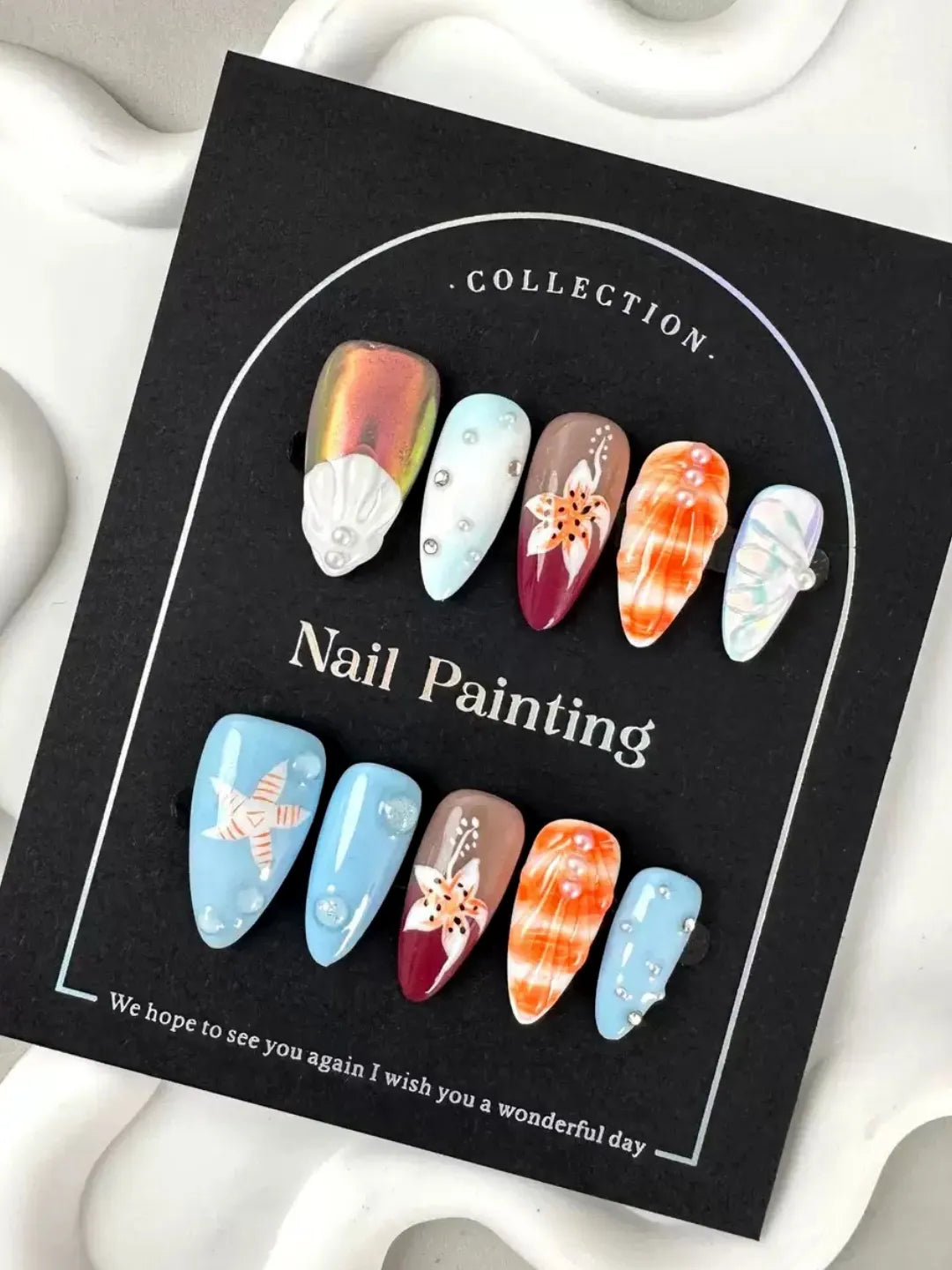 Gradient orange or peach base with hand-painted shells and subtle shimmer — warm and romantic like a sunset, perfect for summer beach or daily wear.