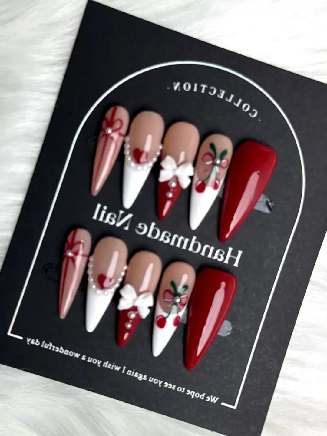 Nude base with hand-painted red cherries and subtle shimmer β sweet, fresh, and elegantly girly, perfect for daily wear or dates.
