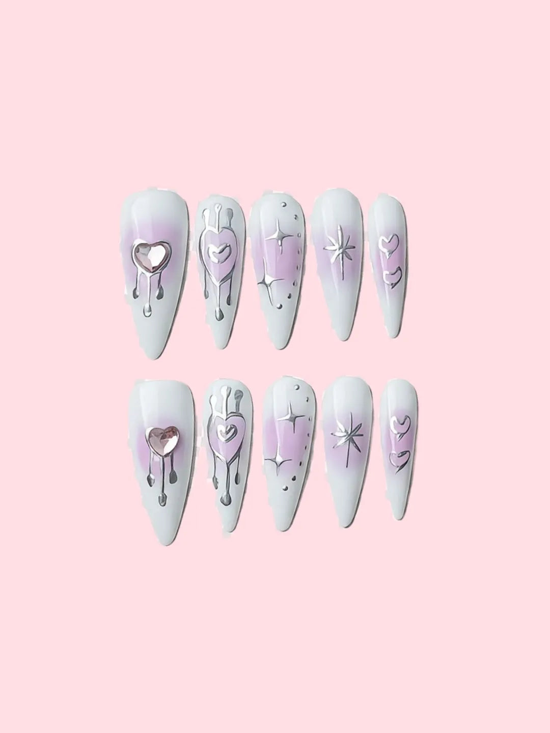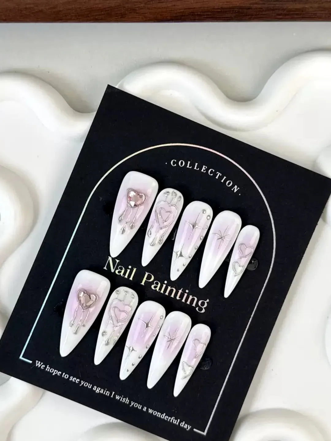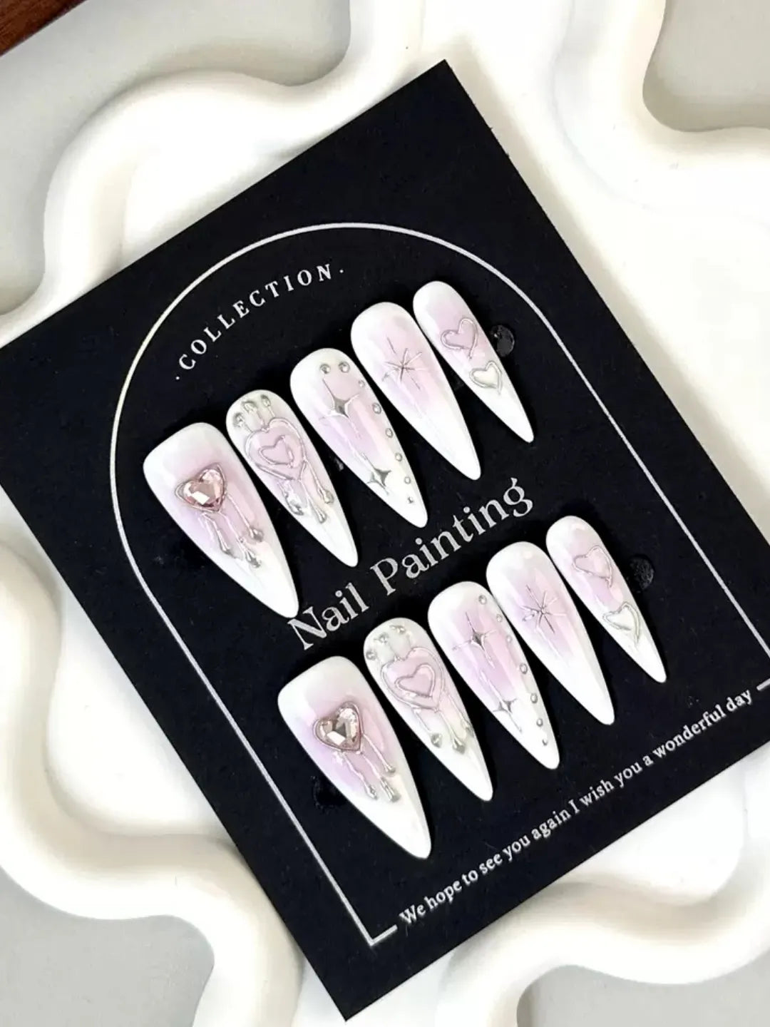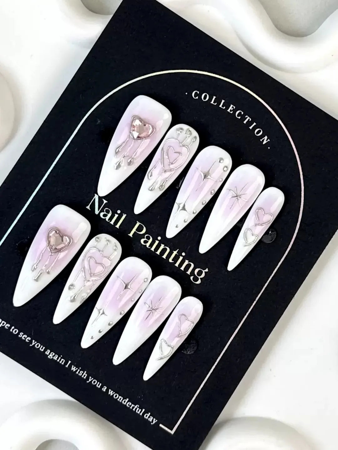 Pink or nude gradient base with metallic lines, glitter, and bold accents — sweet yet edgy, perfect for daily wear or parties.