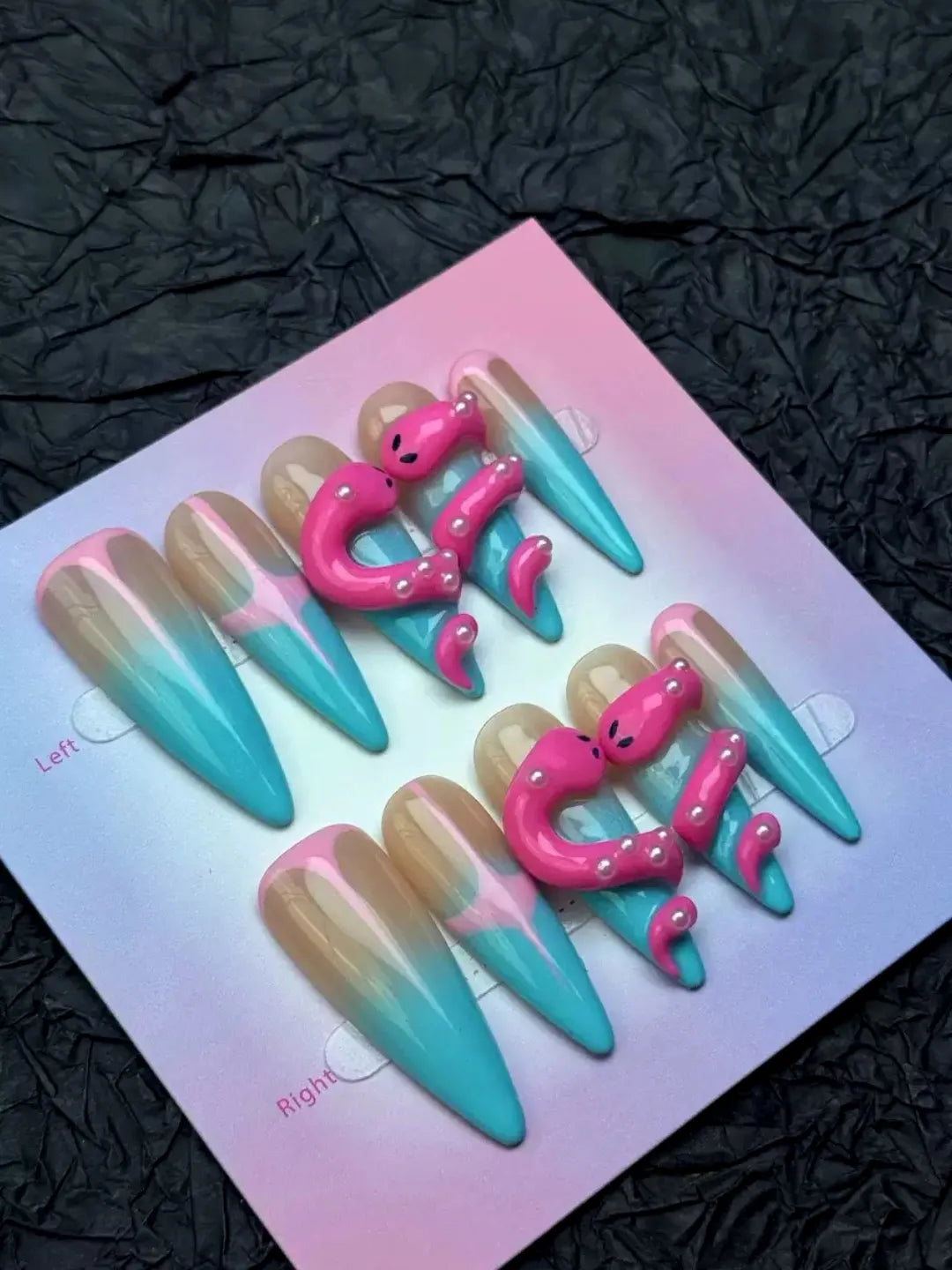 Pink or nude gradient base with hand-painted snake patterns and glitter accents — sweet yet edgy, perfect for daily wear or parties.