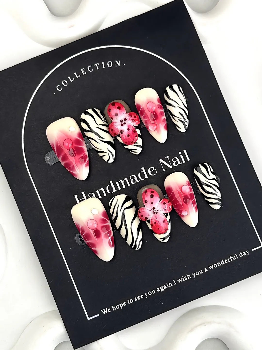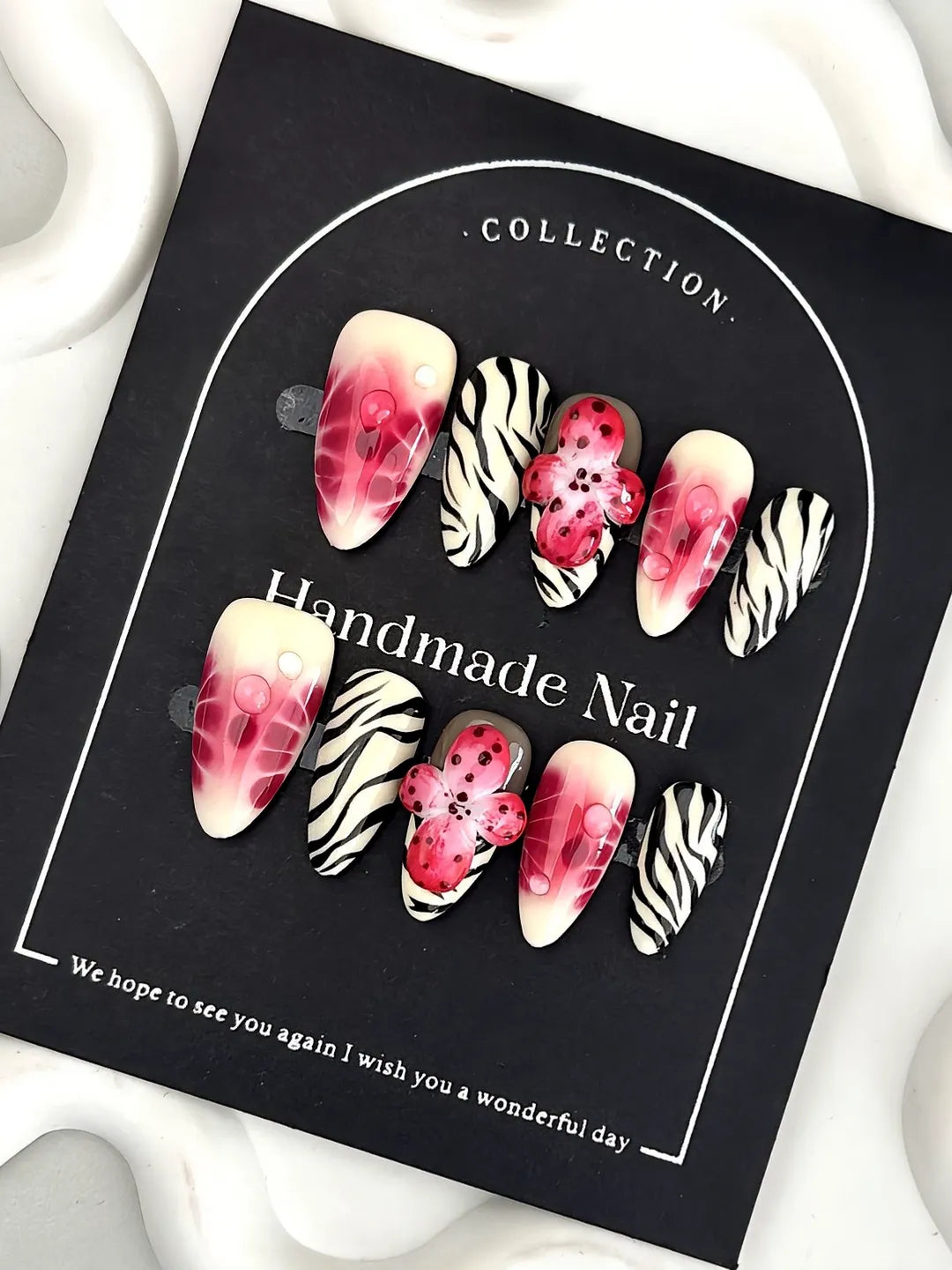 Medium almond nails with zebra print, watercolor pink tips, 3D water drops, and a sculptural floral accent. Edgy, playful, and highly textured.